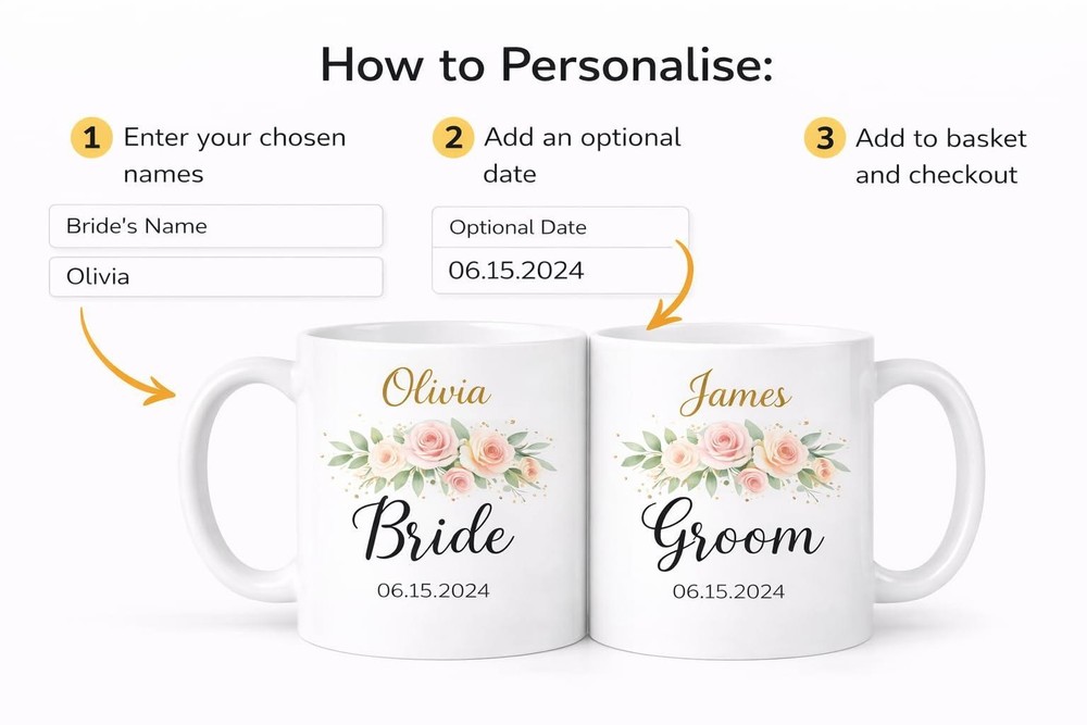 Celebrate your special day with these beautifully personalised wedding mugs, designed to commemorate the love between bride and groom. Each elegant white ceramic mug features delicate pink floral designs and can be customised with your chosen names and wedding date, creating a meaningful keepsake you'll treasure for years to come. The 11 oz capacity is perfect for your morning coffee or evening tea, whilst the high-quality sublimation printing ensures your personalisation won't fade. These dishwasher and microwave safe mugs make an ideal wedding gift, engagement present, or anniversary surprise. Sold as a matching pair, they're printed on both sides for convenience and feature a smooth gloss finish that feels premium in your hands. Simply enter your names and date exactly as you'd like them printed - perfect for newlyweds starting their journey together. PERSONALISED DESIGN: Custom wedding mugs featuring bride and groom names with elegant floral design and optional date personalisation for a unique keepsake PREMIUM QUALITY: 11 oz white ceramic mugs with high-quality sublimation printing, smooth gloss finish, and professional appearance PRACTICAL FEATURES: Dishwasher and microwave safe construction with double-sided printing suitable for both left and right-handed users PERFECT GIFT SET: Sold as matching pair ideal for weddings, engagements, anniversaries, bridal showers, and newlywed couples DURABLE CONSTRUCTION: High-grade ceramic material with fade-resistant printing ensures long-lasting use and treasured memories Listing and template services provided by inkFrog
