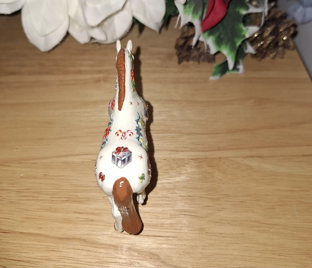 This Custom Breyer Christmas Stablemate is a must-have for any horse lover. With its off-white coat, chestnut mane and tail, and Reindeer design, this horse is sure to catch your heart. It's the perfect addition for any collector or as a decorative piece. This horse is hand painted and decorated by myself to celebrate the fun of the Holidays. He is painted in acrylic paints and sealed in several layers of high gloss sealer. The size of the horses are 4 x 3 inches, making it a perfect addition to any collection. This Breyer Stablemate is a great gift for anyone who loves horses or is a collector looking to add a unique pieces to their collection. This piece is sold as is for decoration and not live show quality.