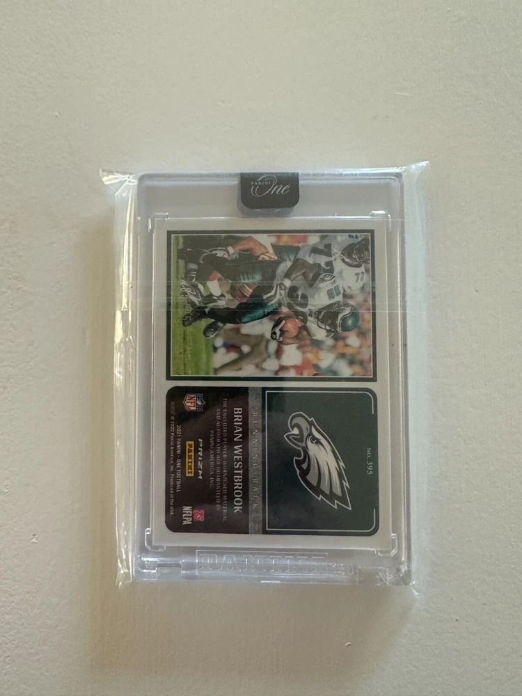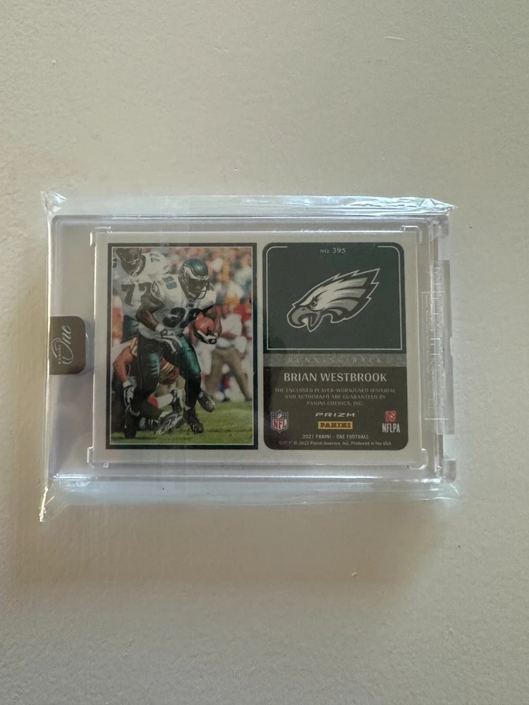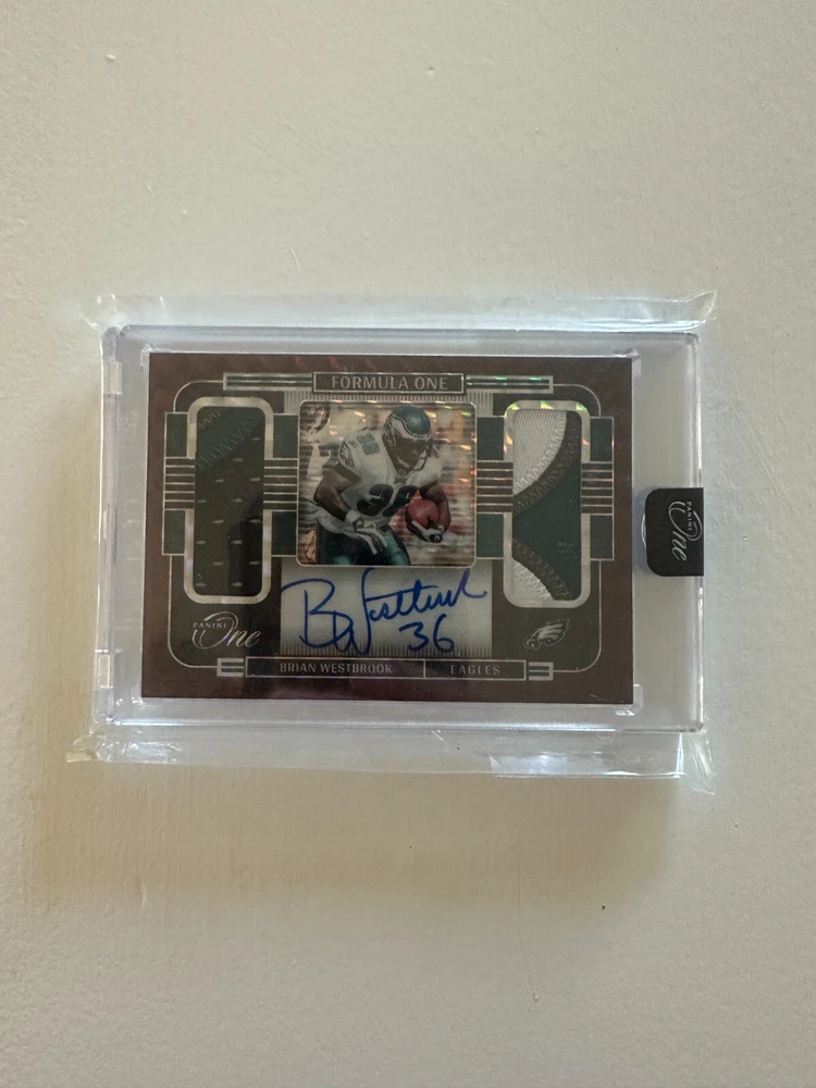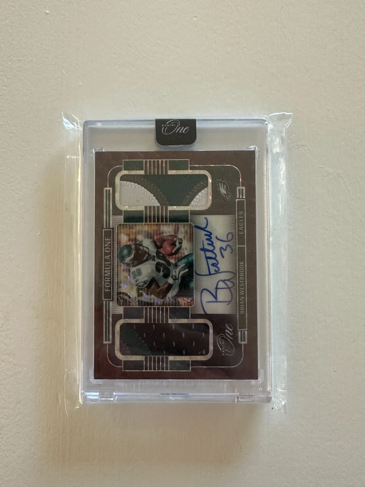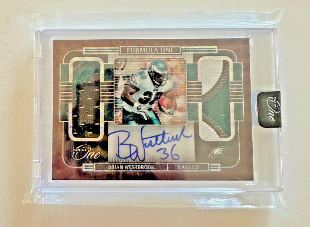 Elevate your collection with the Brian Westbrook RED 2021 Panini One Formula Autograph Dual Patch, a limited edition treasure limited to just 25 prints. This card celebrates the legacy of Philadelphia Eagles' dynamism with a hard-signed autograph by the player himself, authenticated by Panini Authentic for unquestionable legitimacy. The card is a booklet size, featuring a dual patch design that adds a tactile dimension to the collectible. It's part of the revered 2021 Panini One set, a must-have for football enthusiasts and collectors. Vintage in nature, it's a thick card with a 35 Pt. thickness, crafted in the United States, and presented in English.