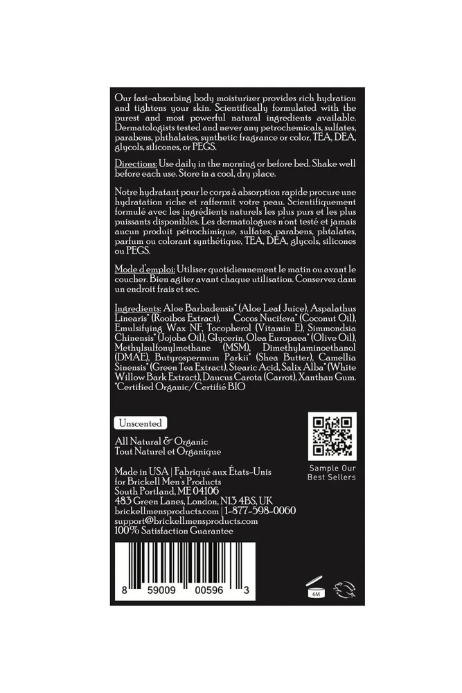 What It Does: Our all natural men's body lotion keeps your skin tight and hydrated in the toughest conditions. An unscented product. Who It’s For: Men of any age with any skin type who want to relieve and prevent dry, cracked skin. How It Works: This light, fast-absorbing body lotion for men is packed with potent natural ingredients to hydrate, protect, and tighten your skin. Key Ingredients: Natural & Certified Organic ingredients, including aloe vera, jojoba oil, vitamin E, and green tea. 99% natural, 80% organic. Who We Are: Brickell creates skincare and grooming products for men using natural & certified organic ingredients. Our products are sold in over 100 countries and have appeared in GQ, Men's Health, Men's Journal, and other popular men’s magazines