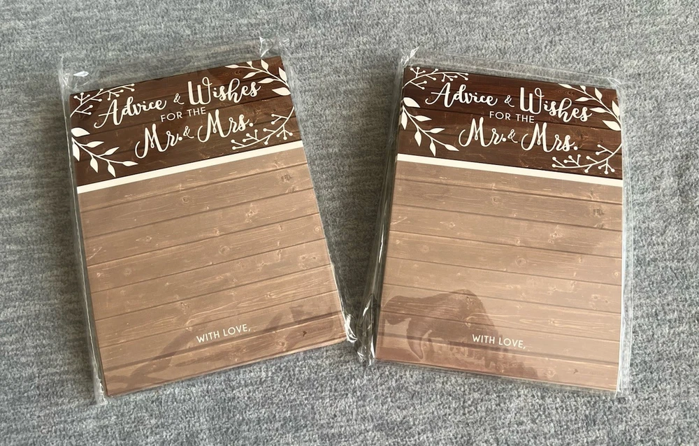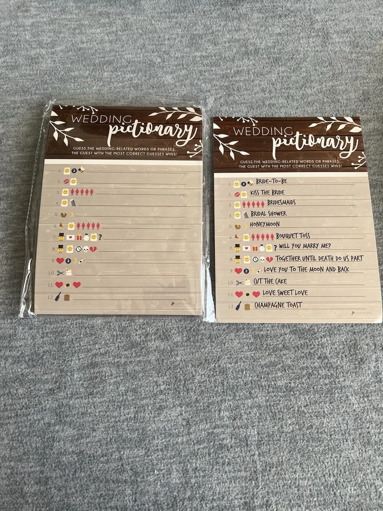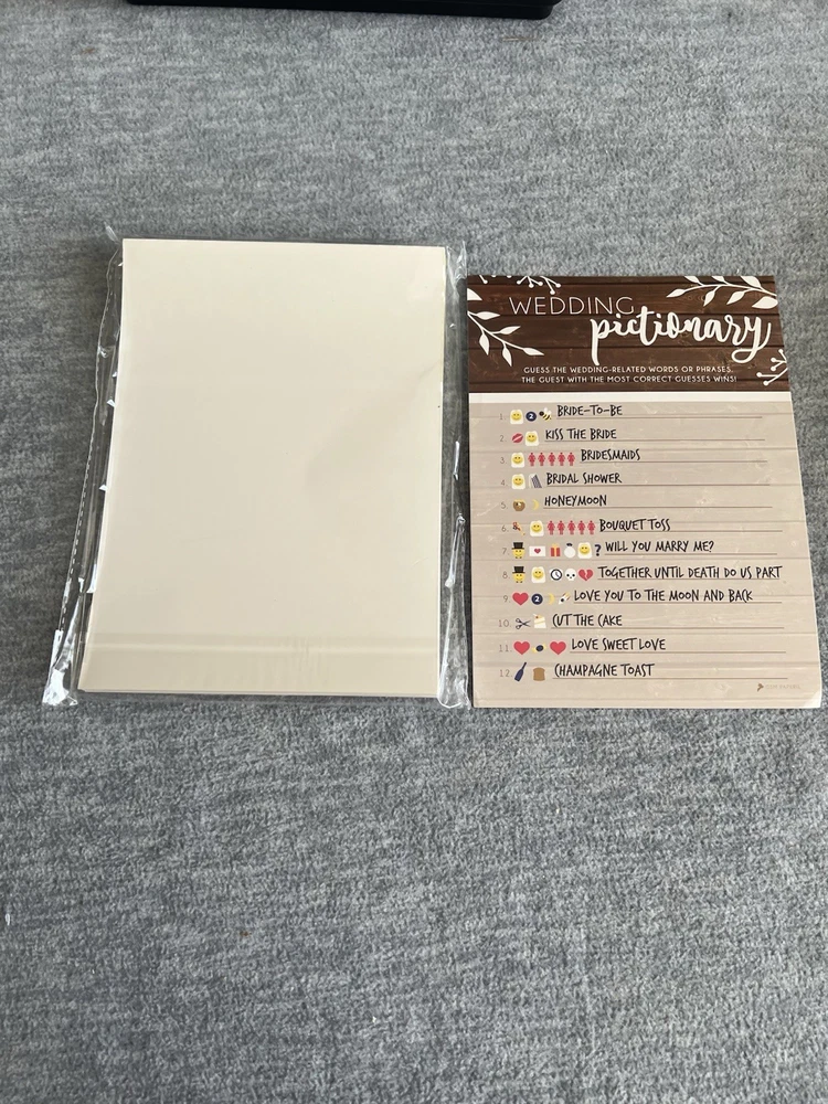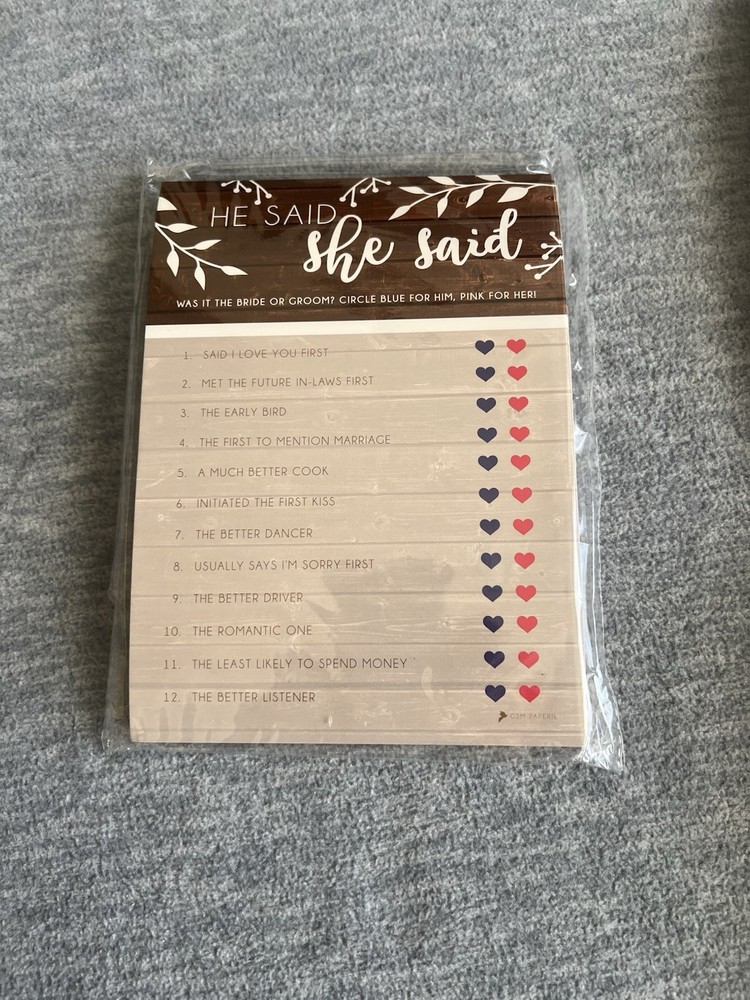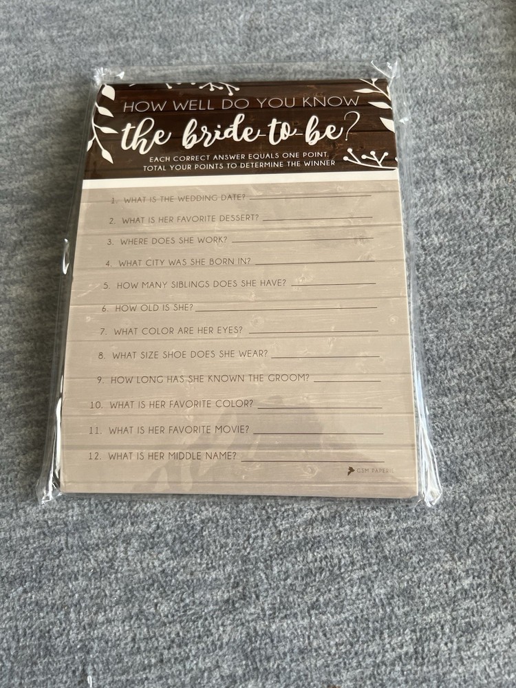 Bridal/wedding Shower style Games Pack 5 Different Games 7x5 Bride Groom Write In New-you receive in this game pack are as follows: -1 pack-how well do you know the bride to be? -1 pack-he said /she said -1pack-bridal bingo -1pack- wedding Pictionary with answer card -2 packs- advice and wishes for the Mr. and Mrs. You get all items shown in the photos above please see photos for specific information Item shipped next day Monday through Friday Pet/smoke free home