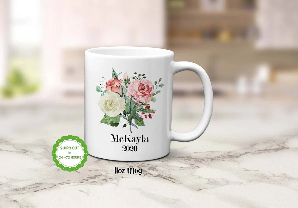 Bridesmaid Personalized Mug Personalized Bridesmaid Gift Bridal Party Gift Product Details.. This high quality 11oz. ceramic white mug has a premium hard coat that provides crisp and vibrant color reproduction sure to last for years. Perfect for all hot & cold beverages. The highest quality printing possible is used. It will never fade no matter how many times you wash it. Material: 100% Ceramic. Print both sides. Dishwasher and Microwave Safe. High Gloss + Premium White Finish. Printed in the U.S.A. Personalized & Custom. We support personalized and custom mug to add custom, when placing an order, you can add notes to the "order note" in shipping address section. Also you can contact us directly via message. Shipping Info. Ready to ship in 1 to 2 business days, All products are made-to-order and proudly printed in the United States. Shipped by USPS and DHL, You will receive your order in 5-7 days. Replace & Refund. All products are defective during shipping broken, chipped will be replaced free of charge. You are not satisfied with the product, we will refund 100% money to you. If any other issues arise, please do not hesitate to message, we would be more than happy to assist you.
