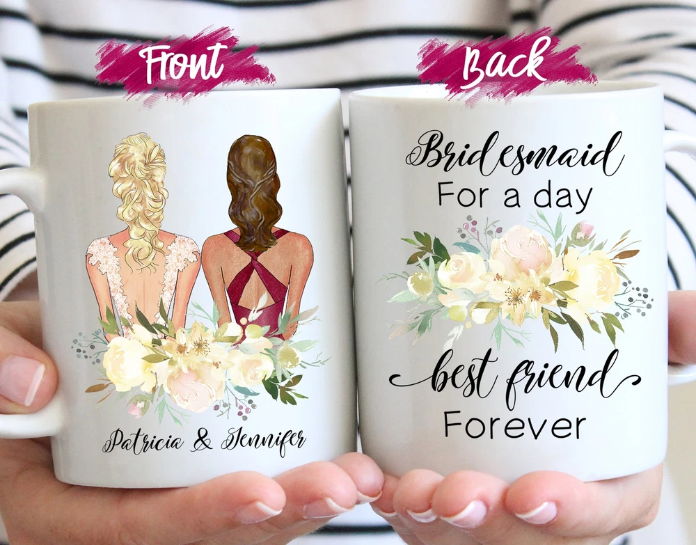 Bridesmaid Proposal Mug Custom Maid Of Honor Mug Personalized Best Friends Gift Product Details.. This high quality 11oz. ceramic white mug has a premium hard coat that provides crisp and vibrant color reproduction sure to last for years. Perfect for all hot & cold beverages. The highest quality printing possible is used. It will never fade no matter how many times you wash it. Material: 100% Ceramic. Print both sides. Dishwasher and Microwave Safe. High Gloss + Premium White Finish. Printed in the U.S.A. Personalized & Custom. We support personalized and custom mug to add custom, when placing an order, you can add notes to the "order note" in shipping address section. Also you can contact us directly via message. Shipping Info. Ready to ship in 1 to 2 business days, All products are made-to-order and proudly printed in the United States. Shipped by USPS and DHL, You will receive your order in 5-7 days. Replace & Refund. All products are defective during shipping broken, chipped will be replaced free of charge. You are not satisfied with the product, we will refund 100% money to you. If any other issues arise, please do not hesitate to message, we would be more than happy to assist you.