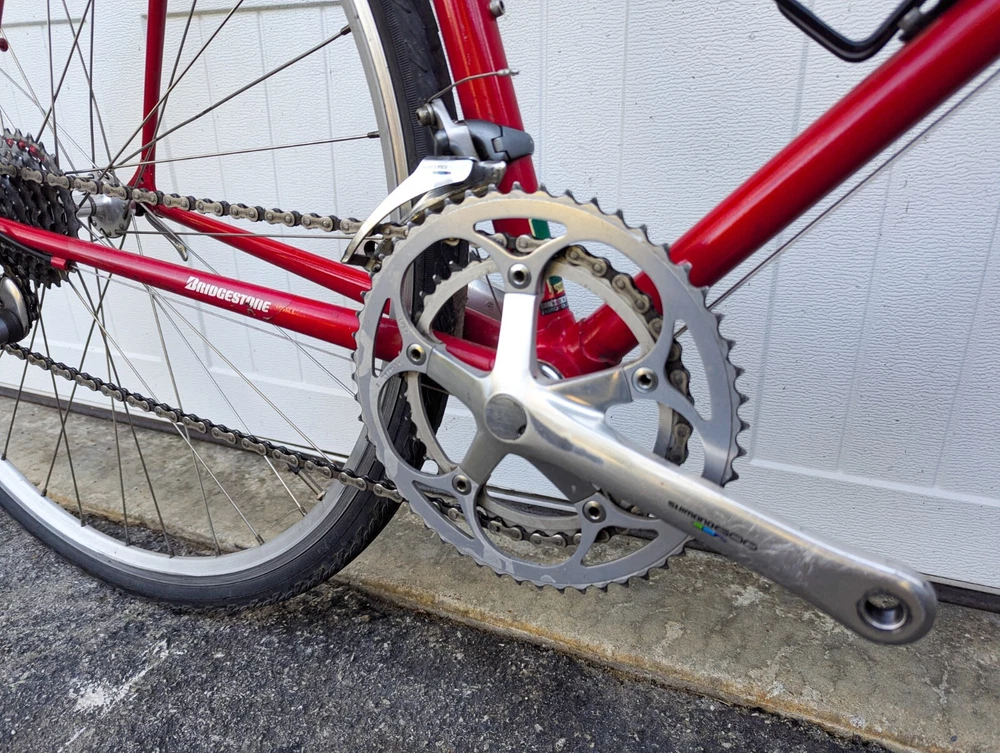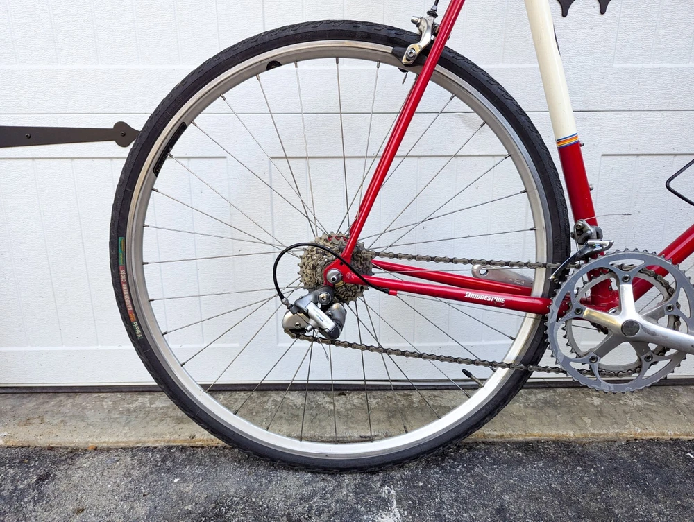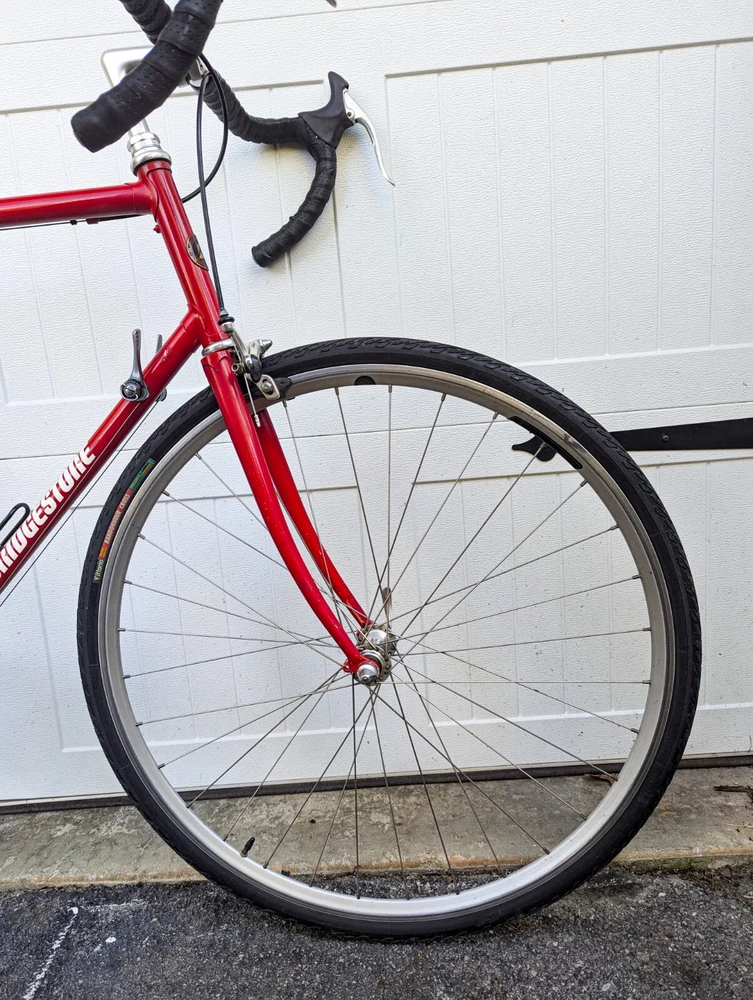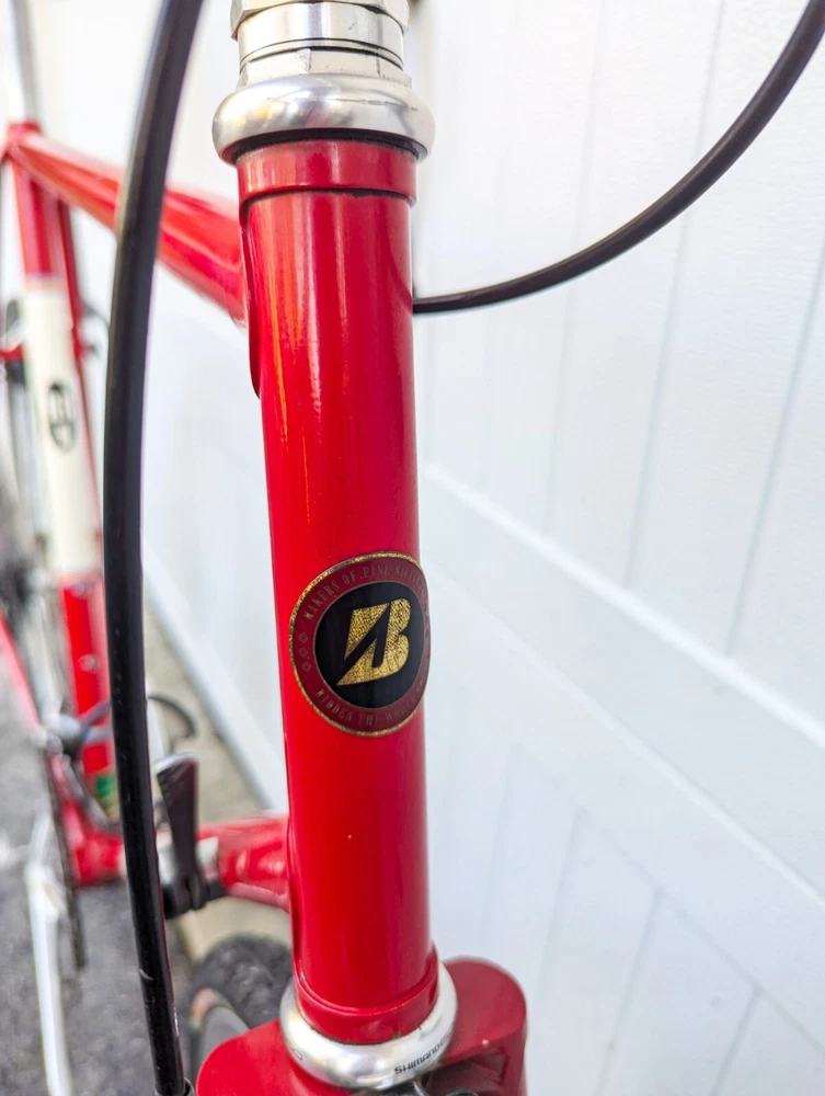 Up for sale is a wonderful Bridgestone RB1 60cm. The frame is in good shape, straight and true. There are a few paint chips from riding, but no dents or dings. BB - TT: 60cm TT: 60cm Standover: 33" Specs: Frameset: Bridgestone RB1 (Shimano 600 headset) Wheelset: Velocity hoops laced to Shimano 600 Hubs with 700x32c Vittoria Randoneur Cross Crankset: Shimano 600 53/39T 175mm Derailleurs: Shimano 600 2x7 Brakes: Dia Comp BRS 300 Saddle: Brooks B17 (w/ Brooks Bar tape