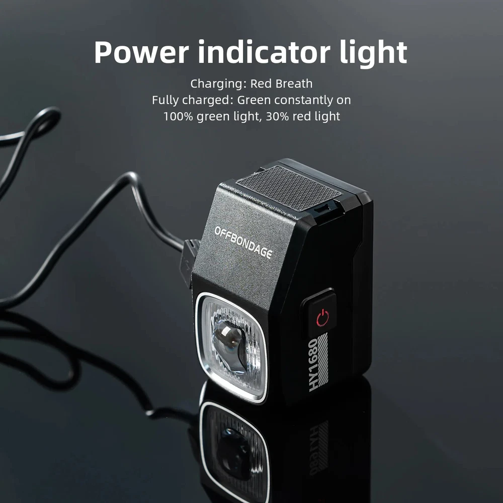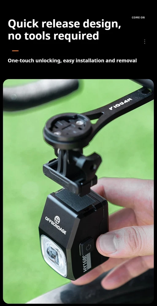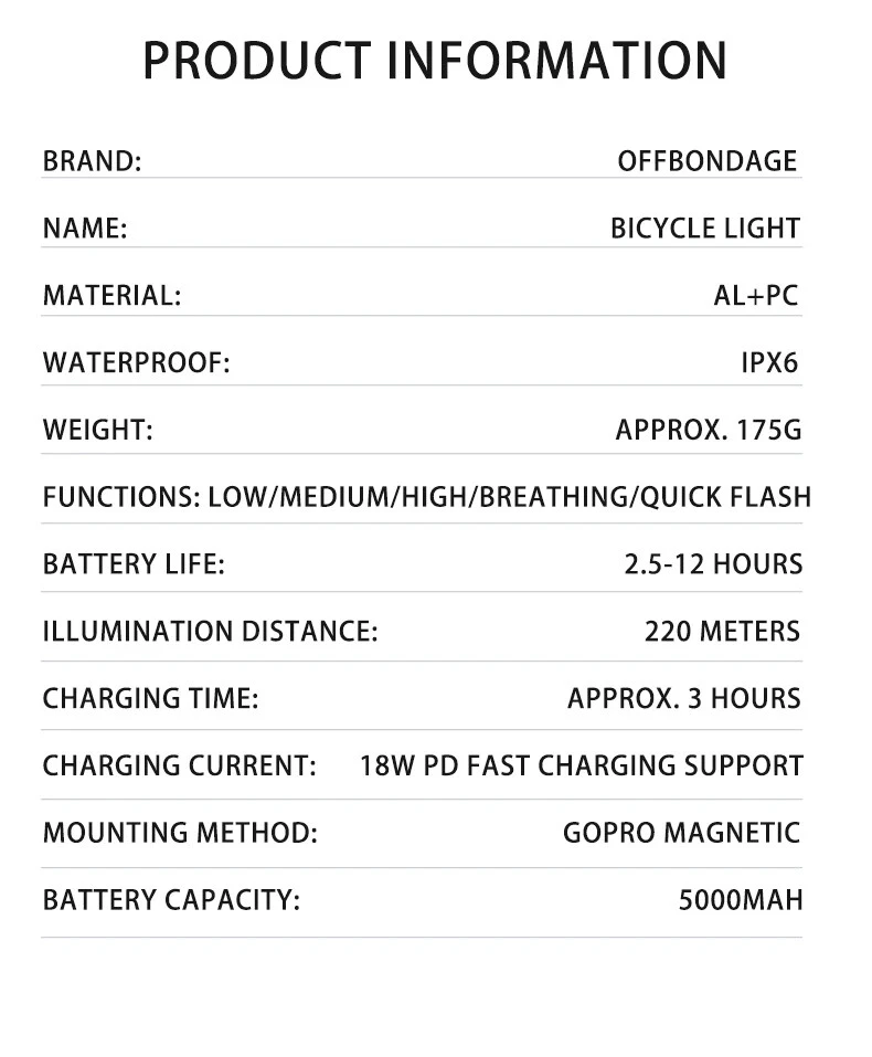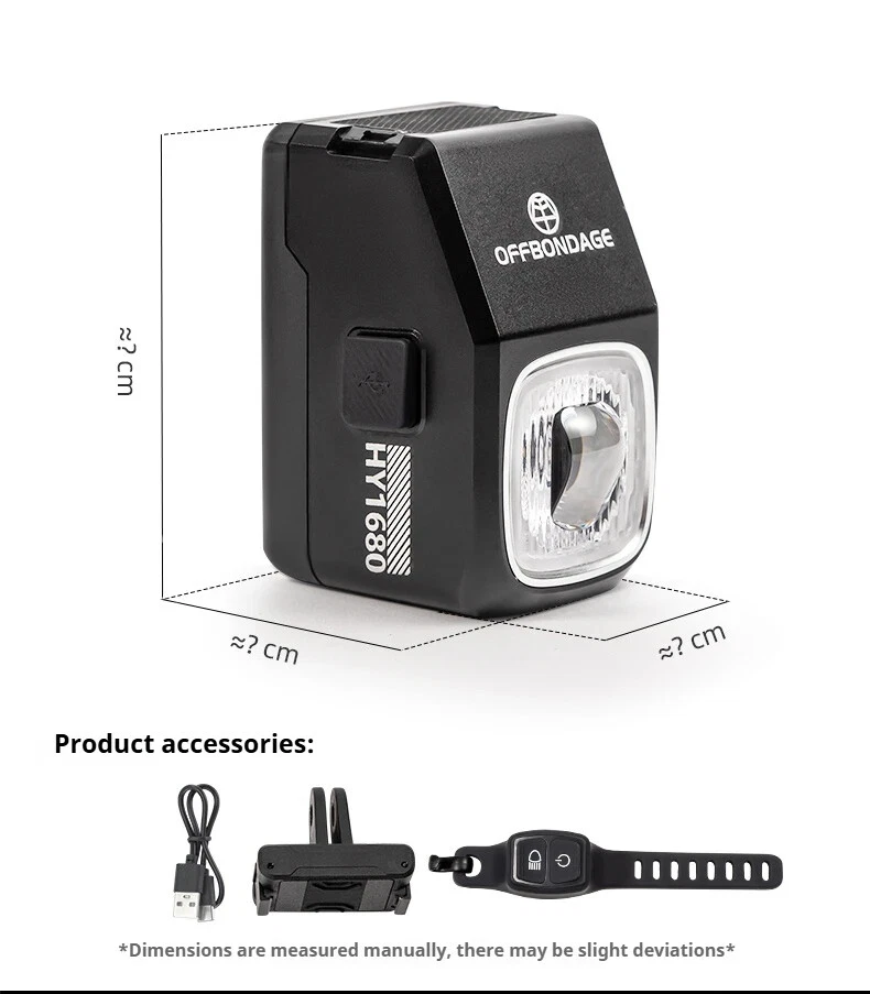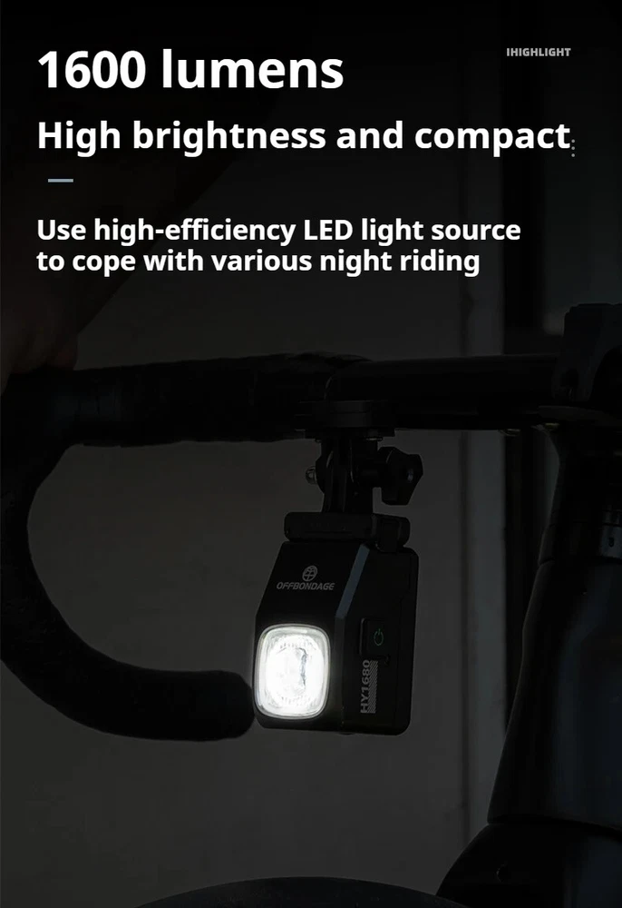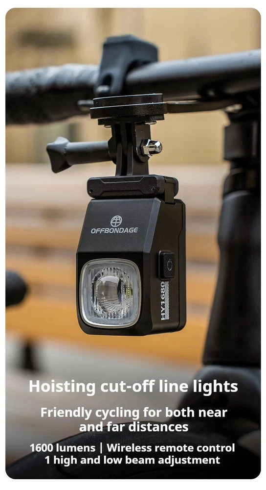 Suspended Inline Bike Light - One-piece High/Low Beam, Friendly Riding 1600 Lumens | Wireless Remote | High/Low Beam Adjustment Multi-Function Design 1600 Lumens Brightness | Wireless Control | Front Hoisting | High/Low Beam Adjustment | IPX6 Waterproof | TYPE-C Charging Product Information Brand: OFFBONDAGE Name: Bicycle Light Material: AL+PC Waterproof: IP65 Weight: Approx. 175g Functions: Low/Medium/High/Breathing/Quick Flash Battery Life: 2.5-12 hours Illumination Distance: 220 meters Charging Time: Approx. 3 hours Charging Current: 18W PD fast charging support Mounting Method: GoPro magnetic Battery Capacity: 5000mAh 1600 Lumens - Compact and Bright Using efficient LED light sources, this light adapts to all kinds of night riding. Battery Life Battery life for different brightness levels: Low: 12 hours Medium: 6 hours High: 3 hours High Beam: 2 hours 50 minutes Flashing: 6 hours Breathing: 4 hours Wireless Remote Control for Convenient Operation Equipped with a wireless remote, easily switch between high/low beams and modes without taking your hands off the handlebars, enhancing riding safety. Lock Function to Prevent Accidental Touches Hold the button for three seconds to lock/unlock the light, preventing accidental operations. Smart Mode Switching with Vibration Sensor The light automatically turns off after 20 seconds of inactivity and wakes up when vibration is detected. High/Low Beam Switching for a Wider View Easily switch between high and low beams, making night riding smoother and ensuring a safe field of vision. IPX6 Waterproof - Ready for Any Weather! No need to worry about rain or bad weather (but avoid long-term immersion). TYPE-C Charging, 5000mAh Large Capacity Battery Red indicator breathes when charging, turns green when fully charged. (100% green light, 30% red light, 5%-0% power - auto shutdown). Quick Release Design - No Tools Needed! One-click unlock, easy installation and removal, making your ride more convenient. 18W Fast Charging - Ride Without Worry! Say goodbye to long charging times, improve efficiency, and enjoy uninterrupted riding. Installation Steps: Connect the lamp body with the magnetic base and ensure they are securely fastened to prevent loose connections. Fix the magnetic base and the bracket with the M5 screw. Turn on the light, adjust the proper riding angle, and then tighten the screws to prevent the light from shaking during the ride. Check again to ensure the lamp is securely fastened to the base. ️ Sturdy Installation, Adaptable to All Terrains! Whether on city streets or country roads, this light stays firmly in place, accompanying you on every ride. The Perfect Companion for Outdoor Cycling Day or night, this bike light is your reliable partner for safe cycling!