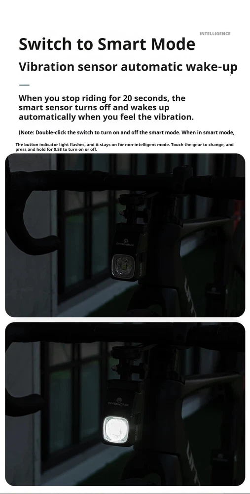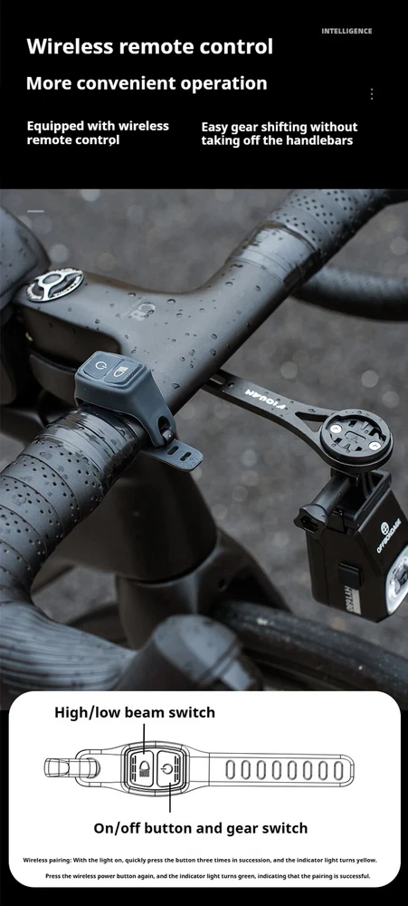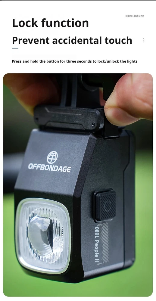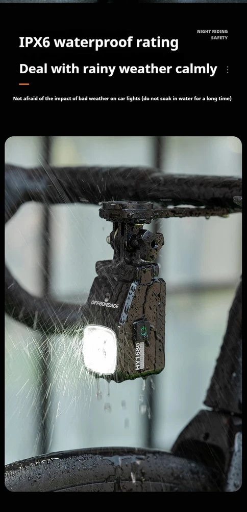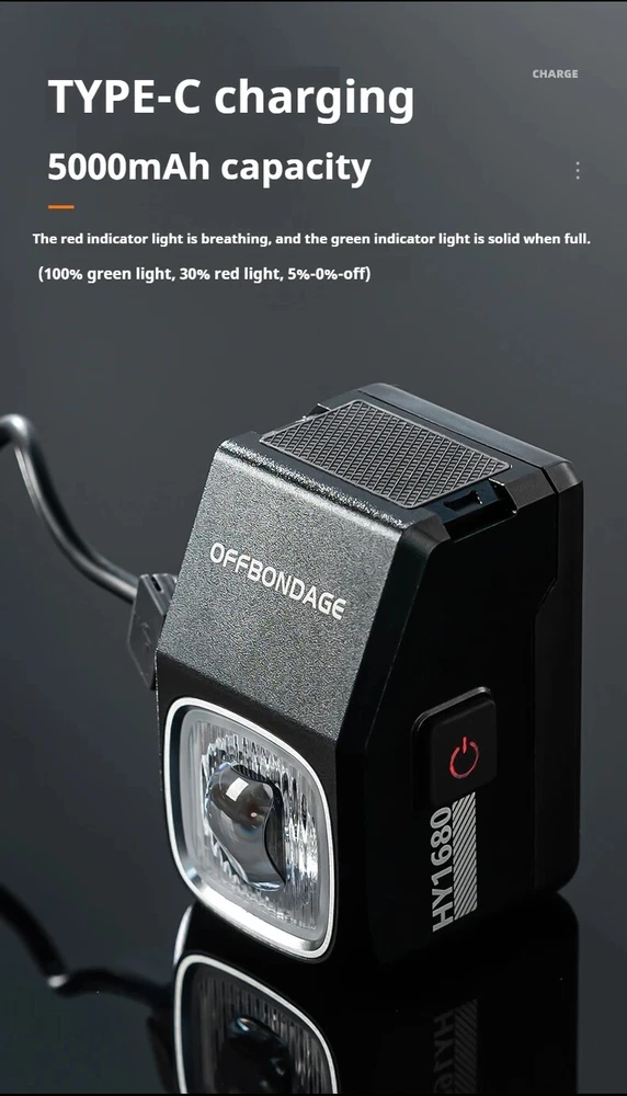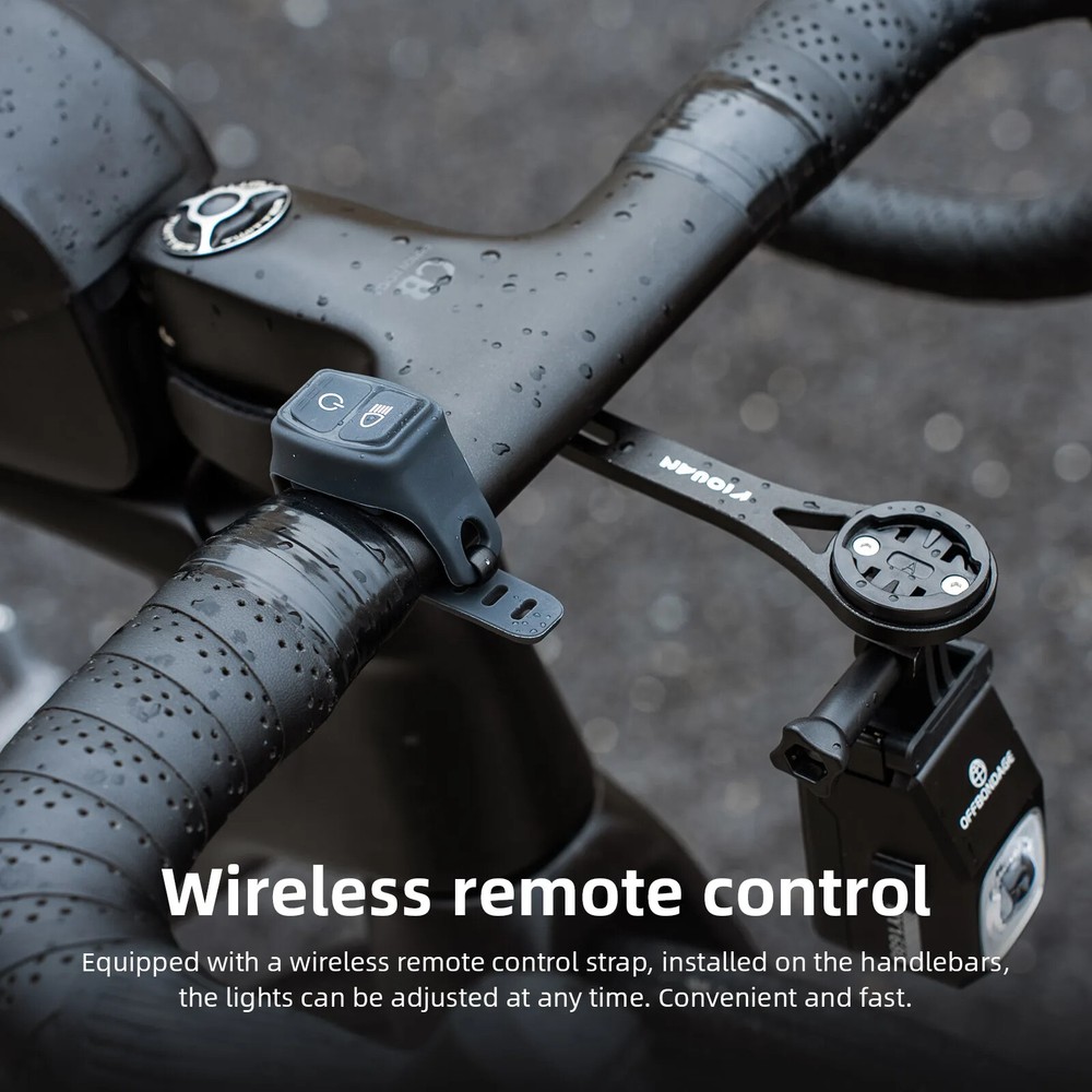 Suspended Inline Bike Light - One-piece High/Low Beam, Friendly Riding 1600 Lumens | Wireless Remote | High/Low Beam Adjustment Multi-Function Design 1600 Lumens Brightness | Wireless Control | Front Hoisting | High/Low Beam Adjustment | IPX6 Waterproof | TYPE-C Charging Product Information Brand: OFFBONDAGE Name: Bicycle Light Material: AL+PC Waterproof: IP65 Weight: Approx. 175g Functions: Low/Medium/High/Breathing/Quick Flash Battery Life: 2.5-12 hours Illumination Distance: 220 meters Charging Time: Approx. 3 hours Charging Current: 18W PD fast charging support Mounting Method: GoPro magnetic Battery Capacity: 5000mAh 1600 Lumens - Compact and Bright Using efficient LED light sources, this light adapts to all kinds of night riding. Battery Life Battery life for different brightness levels: Low: 12 hours Medium: 6 hours High: 3 hours High Beam: 2 hours 50 minutes Flashing: 6 hours Breathing: 4 hours Wireless Remote Control for Convenient Operation Equipped with a wireless remote, easily switch between high/low beams and modes without taking your hands off the handlebars, enhancing riding safety. Lock Function to Prevent Accidental Touches Hold the button for three seconds to lock/unlock the light, preventing accidental operations. Smart Mode Switching with Vibration Sensor The light automatically turns off after 20 seconds of inactivity and wakes up when vibration is detected. High/Low Beam Switching for a Wider View Easily switch between high and low beams, making night riding smoother and ensuring a safe field of vision. IPX6 Waterproof - Ready for Any Weather! No need to worry about rain or bad weather (but avoid long-term immersion). TYPE-C Charging, 5000mAh Large Capacity Battery Red indicator breathes when charging, turns green when fully charged. (100% green light, 30% red light, 5%-0% power - auto shutdown). Quick Release Design - No Tools Needed! One-click unlock, easy installation and removal, making your ride more convenient. 18W Fast Charging - Ride Without Worry! Say goodbye to long charging times, improve efficiency, and enjoy uninterrupted riding. Installation Steps: Connect the lamp body with the magnetic base and ensure they are securely fastened to prevent loose connections. Fix the magnetic base and the bracket with the M5 screw. Turn on the light, adjust the proper riding angle, and then tighten the screws to prevent the light from shaking during the ride. Check again to ensure the lamp is securely fastened to the base. ️ Sturdy Installation, Adaptable to All Terrains! Whether on city streets or country roads, this light stays firmly in place, accompanying you on every ride. The Perfect Companion for Outdoor Cycling Day or night, this bike light is your reliable partner for safe cycling!