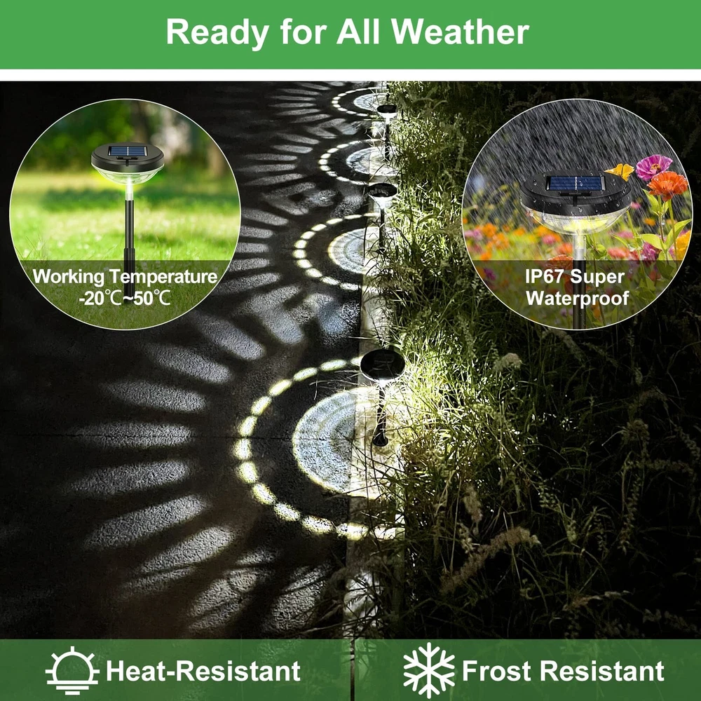 Bright Solar Pathway Lights 8 Pack, Warm White + Cool White LED Outdoor IP67 Waterproof Solar Powered Garden Lights for Walkway Yard Backyard Lawn Landscape Lighting Decor Product Details Size: 8 Pack Brand: Nupostai UPC: 619317420526 EAN: 0619317420526 MPN: Does not apply Finish Type: Black Painted" or "Black Powder Coated Base Material: Acrylonitrile Butadiene Styrene Product Dimensions: 16.42"D x 16.42"W x 16.42"H Item Weight: 3.42 Pounds Lamp Type: LED Product Dimensions : 16.42 x 16.42 x 16.42 inches; 3.42 Pounds Batteries : 8 AA batteries required. (included) Date First Available : January 31, 2022 Manufacturer : Nupostai Customer Reviews: 4.5 4.5 out of 5 stars 1,048 ratings Finish Type: Black Painted" or "Black Powder Coated Base Material: Acrylonitrile Butadiene Styrene Product Dimensions: 16.42"D x 16.42"W x 16.42"H Item Weight: 3.42 Pounds Lamp Type: LED Shade Color: User Selectable(Warm White/ Off /Cool White) Shade Material: High Intesity LEDs,High Capacity Battaries,High-impact ABS,High Efficiency Solar Panel Switch Type: Push Button Style: Solar Pathway Lights for Outdoor Lighting and Garden Decoration Brand: Nupostai Color: Cool white+Warm white Special Feature: Adjustable light pole for different Height, 2 Lighting Mode(Mode 2 and Mode 1 ), Warm White for Lighting, Project a charming and sunflower pattern with larger size, Illuminate and decorate the garden or path Light Source Type: LED Material: Acrylonitrile Butadiene Styrene Room Type: Outdoor Pathway Garden Patio Walkway Driveway Lawn Backyard Flowerbed Fence Porch Wall Pool Balcony Recommended Uses For Product: Decoration Power Source: Solar Powered Shape: Solar Stake Lights with 360° Super Bright Lighting Number of Light Sources: 8 Connectivity Technology: USB Included Components: 8 x built-in Rechargeable Batteries, 8 x Ground Stakes, 8 x Pathway Lights, 1 x Manual Is Waterproof: True Bulb Shape Size: A19 Mounting Type: Ground Mount Number of Items: 8 Lighting Method: 360° Downward Round Pattern Control Method: Remote Indoor/Outdoor Usage: Outdoor Specific Uses For Product: Outdoor Solar Garden Lights decorate and illuminate the Terrance,Yard,Patio,Lawn,Driveway,Pool, Pathway,Balcony,Camping,Steps,Fence,Sidewalk,Flower Bed,Pond, Landscape,Walkway,Path,Backyard,Stairs Water Resistance Level: Waterproof Installation Type: Insert Into Ground or Fixed on Deck Number of Pieces: 8 Efficiency: [INF] High Voltage: 12 Volts (DC) Brightness: 80 Lumen Is Cordless?: Yes UPC: 619317420526 Size: 8 Pack Manufacturer: Nupostai Item Weight: 3.42 pounds Batteries: 8 AA batteries required. (included) Finish types: Black Painted" or "Black Powder Coated Special Features: Adjustable light pole for different Height, 2 Lighting Mode(Mode 2 and Mode 1 ), Warm White for Lighting, Project a charming and sunflower pattern with larger size, Illuminate and decorate the garden or path Plug Format: A- US style Batteries Included?: Yes Batteries Required?: Yes Bulb Features: Sliding Selectable Switch(Mode 2/ Off /Mode 1) Date First Available: January 31, 2022 High Quality&Longer LightingNupostai's solar lights outdoor waterproof use high-quality ABS material are more durable and no rust than cheap solar garden lights.Premium solar panel and build-in 800mAh higher capacity battery which means our solar outdoor lights can collect and store more solar energy,continuous lighting for 9-13hrs after charging for 4-6hours in sun,no need worry about brightness down or stopping work which greatly meets your needs for brightness effect and lighting duration. 2 Lighting Mode&High-BrightnessNupostai's outdoor walkway lights solar powered are designed with 2 light modes(Warm White&Cold White),which use high-power LED lamp beads and high transmittance lampshade make our lights more brighter than ordinary solar path lights,which can be more perfect to cast gorgeous sunflower pattern and decorate your garden,lawn,walkway, flowerbed,making them more beautiful and colorful. 2 Install Ways&Solar Powered&Maintenance-freeNupostai's maintenance-free solar powered outdoor lights is easy to assemble,just turn on the external switch and insert the stakes into ground as a solar ground lights or put it on flat table.solar backyard lights are 100% solar energy,auto absorbs sunlight during the day and auto light up at night,solar lawn lights is specially designed for you and fully practical which saving the workforce and expensive electricity bill. Creative Design&Attractive patternOutdoor solar pathway lights are designed well with adjustable height and convenient external switch,excellent lighting design greatly meets your different lighting and decoration needs,such as halloween and christmas.Solar yard lights with the black exquisite appearance and crystal transparent cover looks more advanced and textured,which casts charming patterm raise your yard grade and house's value,also allow you to enjoy the light shows every night. IP67 Waterproof Use It AnywhereThe new upgrade solar driveway lights use IP67-more advanced sealing and waterproof tech,no need worry about bad rain,snow weather,every solar sidewalk lights has been strictly inspected to ensure long-term use,It's specially designed to illuminate outdoor and walkway far from exterior outlets.Installing solar patio lights means you can spend more outdoor time with your family,garden solar lights is a integral part of landscaping design.