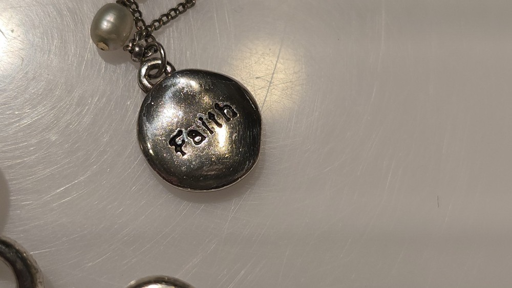 This is a 3 piece lot of all Brighton jewelry, including a floral panel bracelet, faith pendant necklace with genuine pearl accent, and door knocker style 2 tone earrings. Some wear to clear coating, not highly noticeable when wearing. This coating is used to prevent tarnish but wears off over time. I will include a free tarnish removal cloth with the lot, which works very well on Brighton jewelry. Thanks for looking! Please ask any questions BEFORE purchasing/offer, and see my eBay store for more!