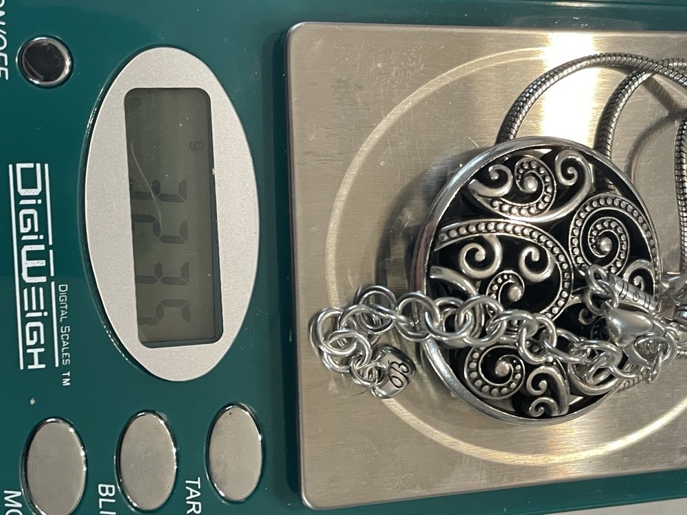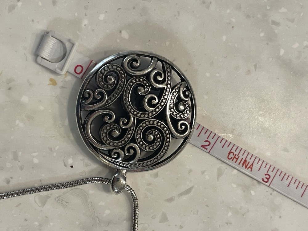 The Brighton Necklace is a stylish fashion jewelry piece that features a very good cut grade and a charming pendant with a pavé setting style. The necklace is in a lovely silver color and has a sentimental theme of love. It is adjustable in length and does not have any secondary stones, making it a versatile and elegant accessory. Made by the reputable brand Brighton, this necklace is perfect for adding a touch of sophistication to any outfit. * Please look at photos, as this is the exact item that you will receive! Pictures are the best description and feel free to ask questions of items before bidding. Please note I usually sell preowned or vintage items that were cherished by a previous owner, and may have been worn and I cannot guarantee authenticity. Thus items are rarely in "mint/perfect" condition. Each item is closely looked at before listed, and it is described as detailed as possible. Please refer to the item pictures to view more about their condition.
