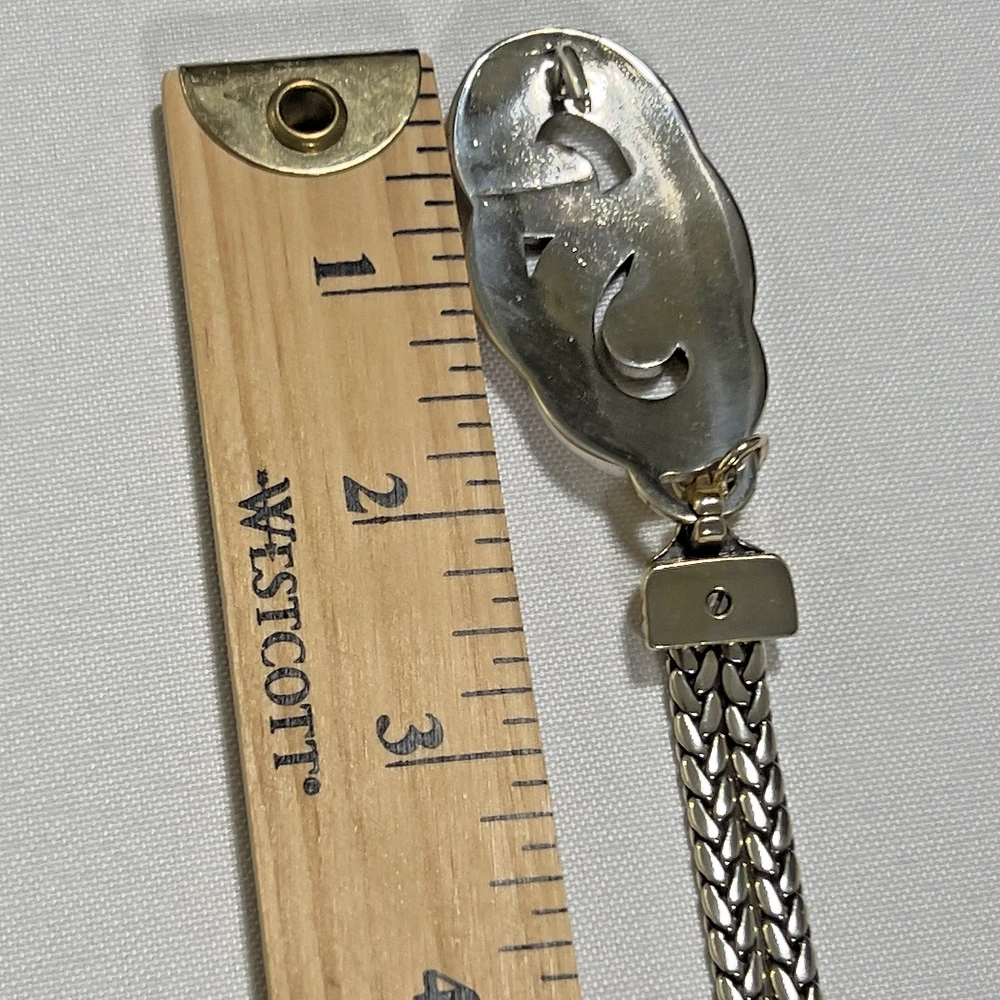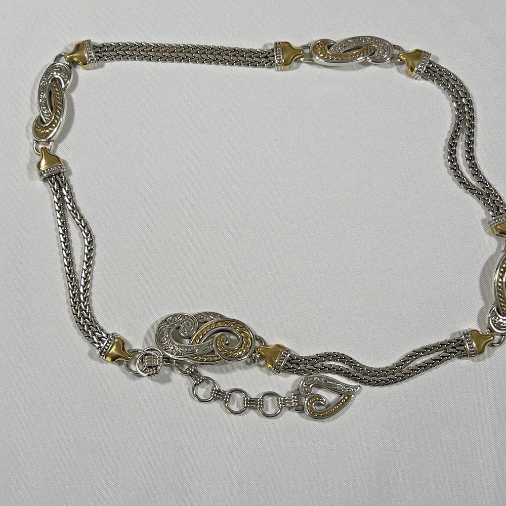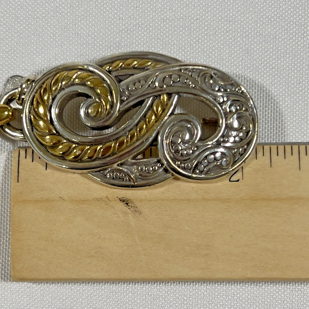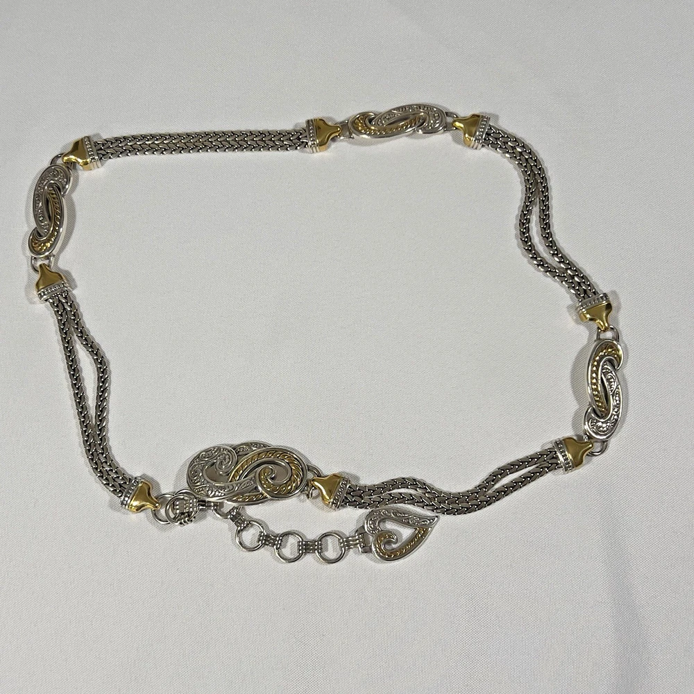 The Brighton Bali Hai Scroll Chain Metal Belt is a stylish and adjustable accessory for women. Made of metal with a herringbone pattern and heart character, this two-tone silver and gold belt features a skinny design and scroll accents. With a vintage appeal and classic style, this chain belt adds a touch of elegance to any outfit. The adjustable size makes it perfect for a waist size of 31-33 inches, while the nickel tone hardware ensures durability and quality. Made in Taiwan, this Brighton belt is a must-have for those who appreciate timeless fashion. *** Shipping costs are what I am charged.*** I do not control the cost of shipping.
