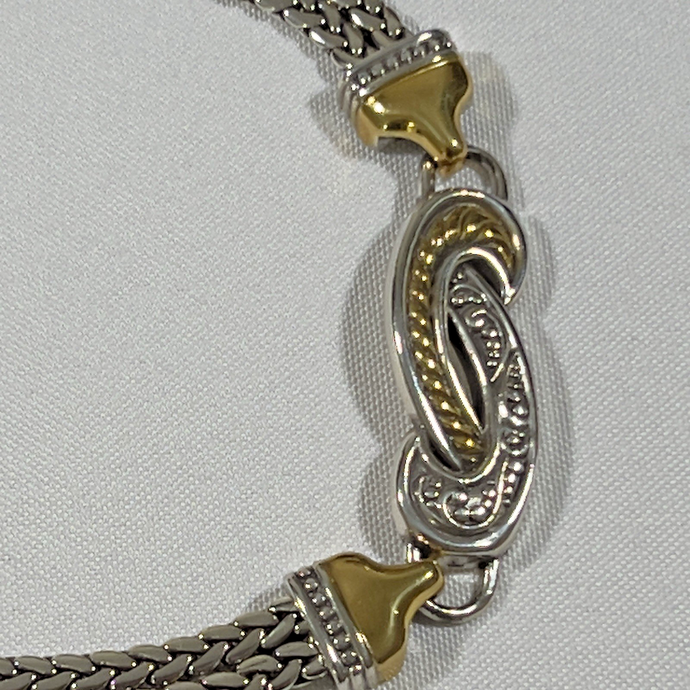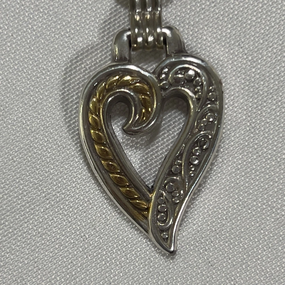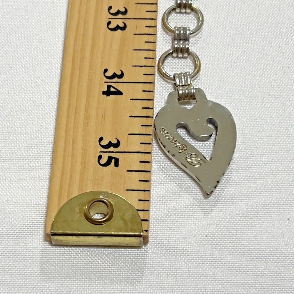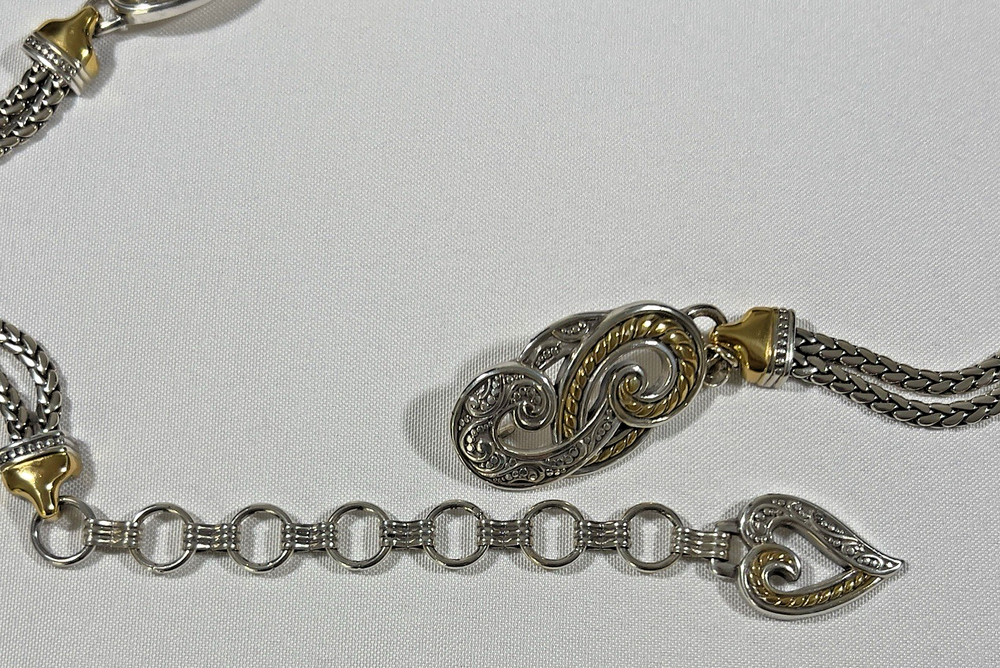 The Brighton Bali Hai Scroll Chain Metal Belt is a stylish and adjustable accessory for women. Made of metal with a herringbone pattern and heart character, this two-tone silver and gold belt features a skinny design and scroll accents. With a vintage appeal and classic style, this chain belt adds a touch of elegance to any outfit. The adjustable size makes it perfect for a waist size of 31-33 inches, while the nickel tone hardware ensures durability and quality. Made in Taiwan, this Brighton belt is a must-have for those who appreciate timeless fashion. *** Shipping costs are what I am charged.*** I do not control the cost of shipping.