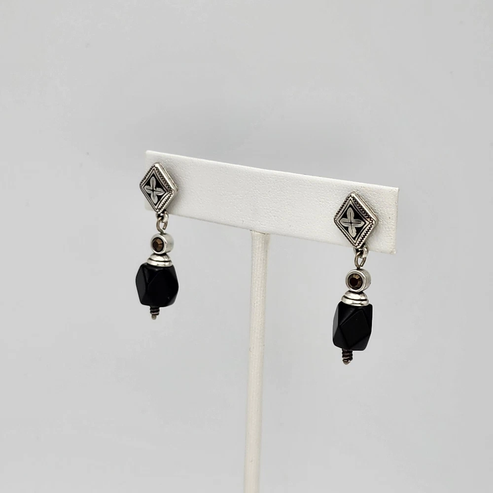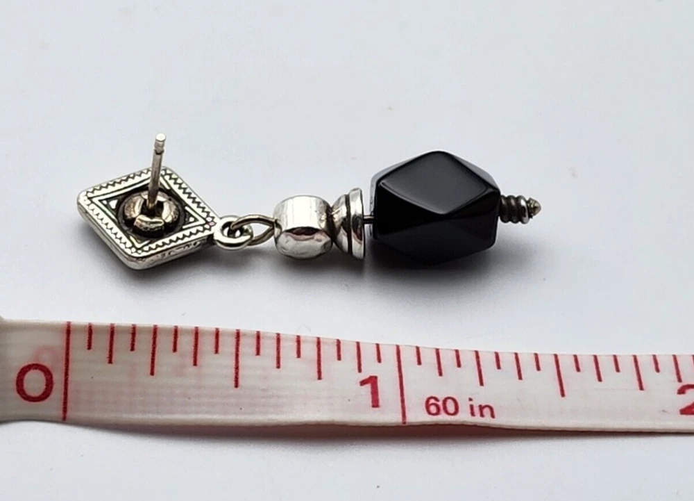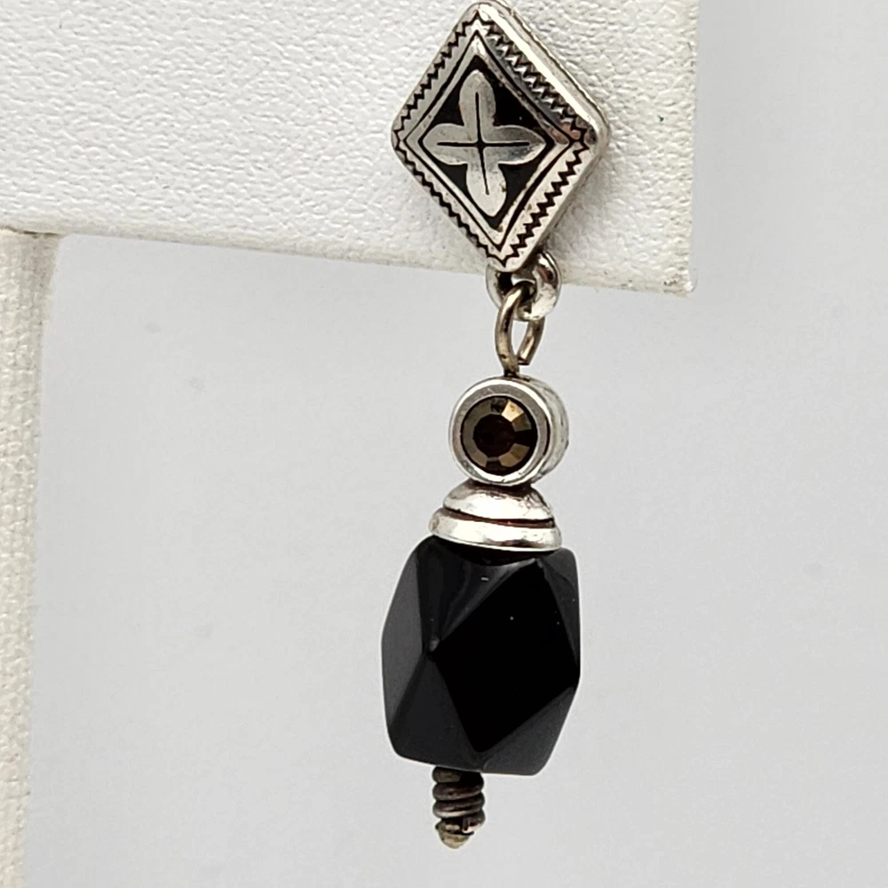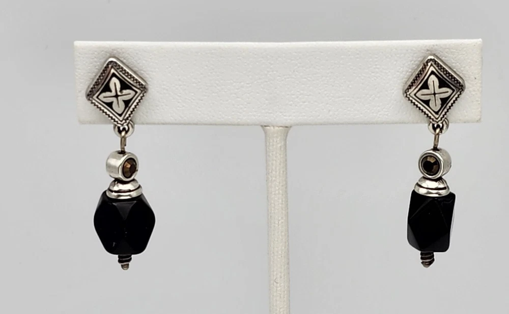 Closure:ButterflyCut Grade:n/agtin13:Does not applySecondary Stone:Crystal, GemstoneColor:Silver, BlackMain Stone Shape:RoundSigned:NoEar Area:LobeMain Stone:Black OnyxSeller Notes:“Good Condition. See Pics For Details.”Metal Purity:UnknownMain Stone Color:BlackSetting Style:n/aAntique:NoCountry of Origin:UnknownStyle:Dangle/DropCountry/Region of Manufacture:UnknownMain Stone Creation:UnknownTheme:BeautyType:EarringsMetal:Silver PlatedVintage:YesBrand:BrightonMaterial:CrystalItem Length:1.5"UPC:Does not applyMain Stone Treatment:Unknown
