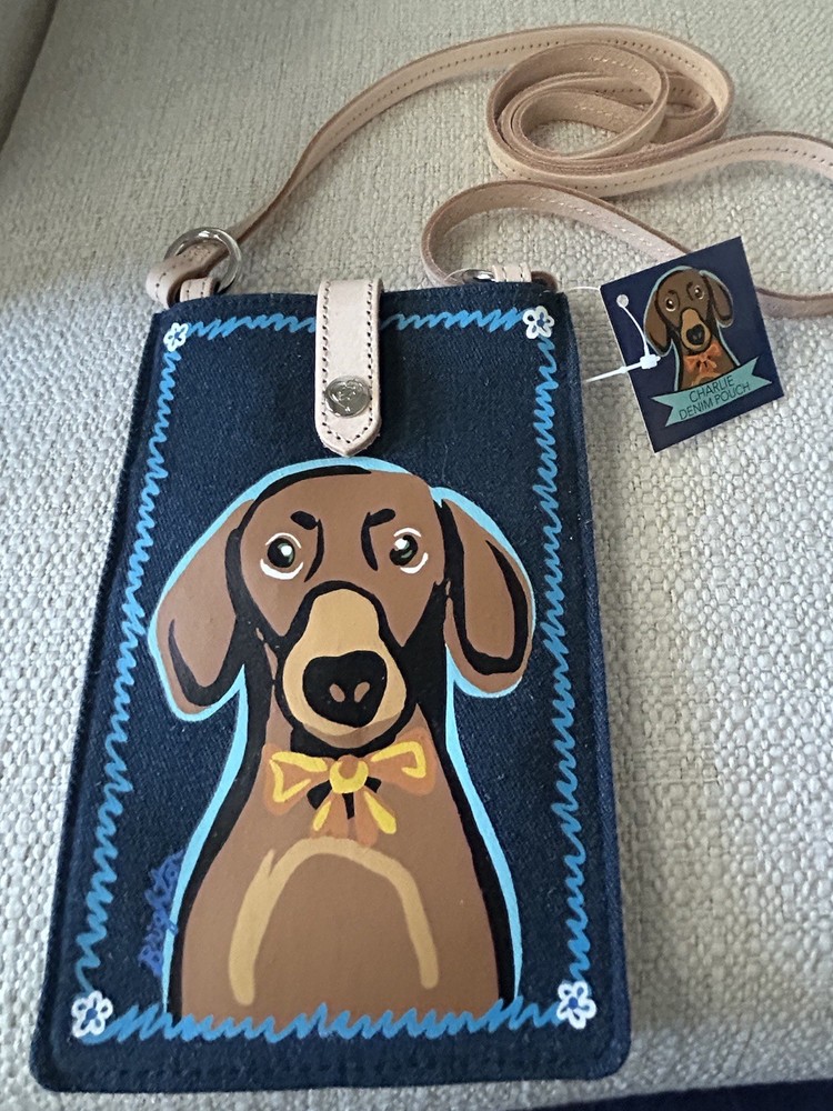Charlie Denim Pouch Starring a member of our “fur family,” this pouch features our designer Catherine Hong’s hand painted art, which we printed onto fine denim fabric. This way you can take your four-legged friend with you everywhere! It’s all about being minimal and just carrying what you need – or if you are a maximalist you can tuck this pouch into your tote. A leather strap makes it a super-versatile crossbody. Exterior Material Denim Top Closure Snap Exterior Pockets 2 Strap 23" Total Width 5 1/4" Height 8" Depth 1" Weight 0.4 lbs