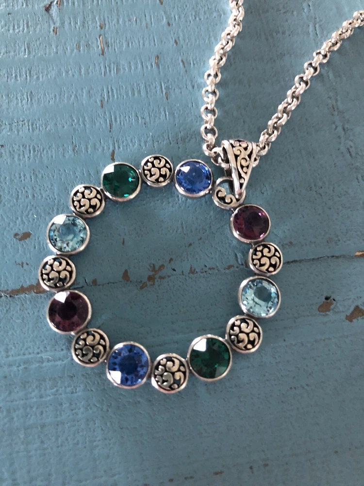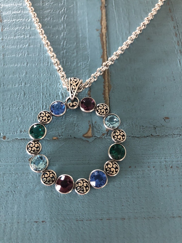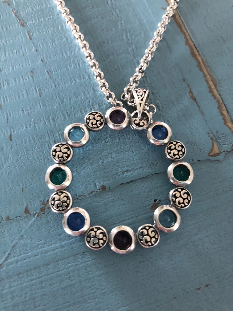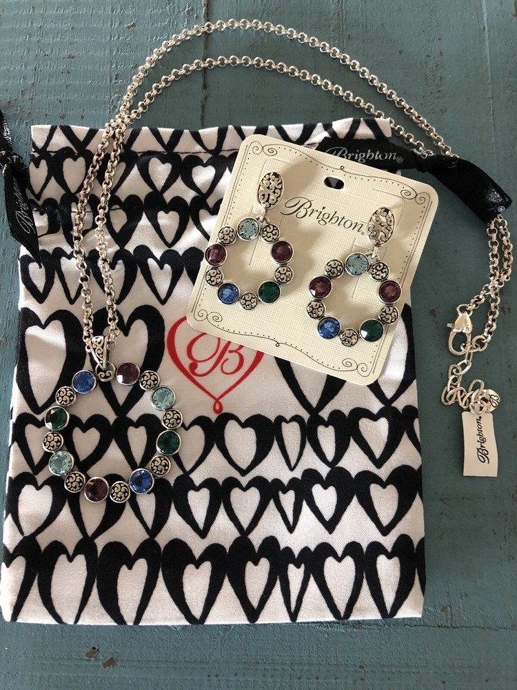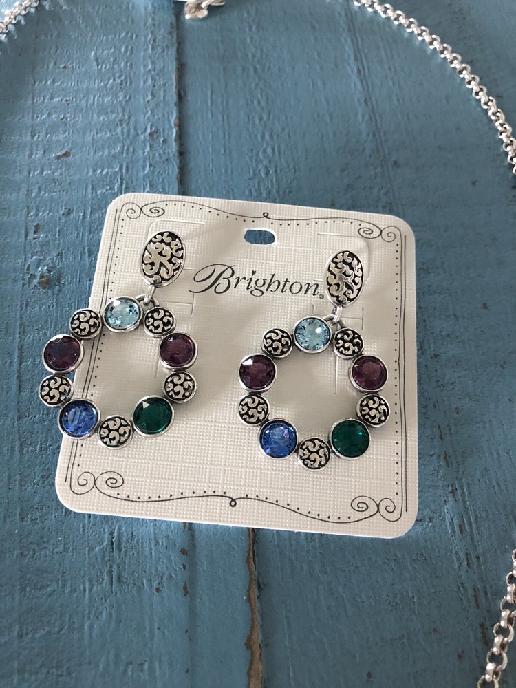 This Brighton Elora Gems Circle Post Colorful Earrings Necklace Set includes a pair of colorful earrings and a matching necklace, making it a versatile and stylish accessory set. The vibrant colors and elegant design of the pieces make them perfect for adding a pop of color to any outfit. The earrings feature a circle shape and colorful gems, while the necklace has a coordinating design. The set comes in a pouch for easy storage and gifting, making it an ideal present for a loved one or a trendy addition to your wardrobe.