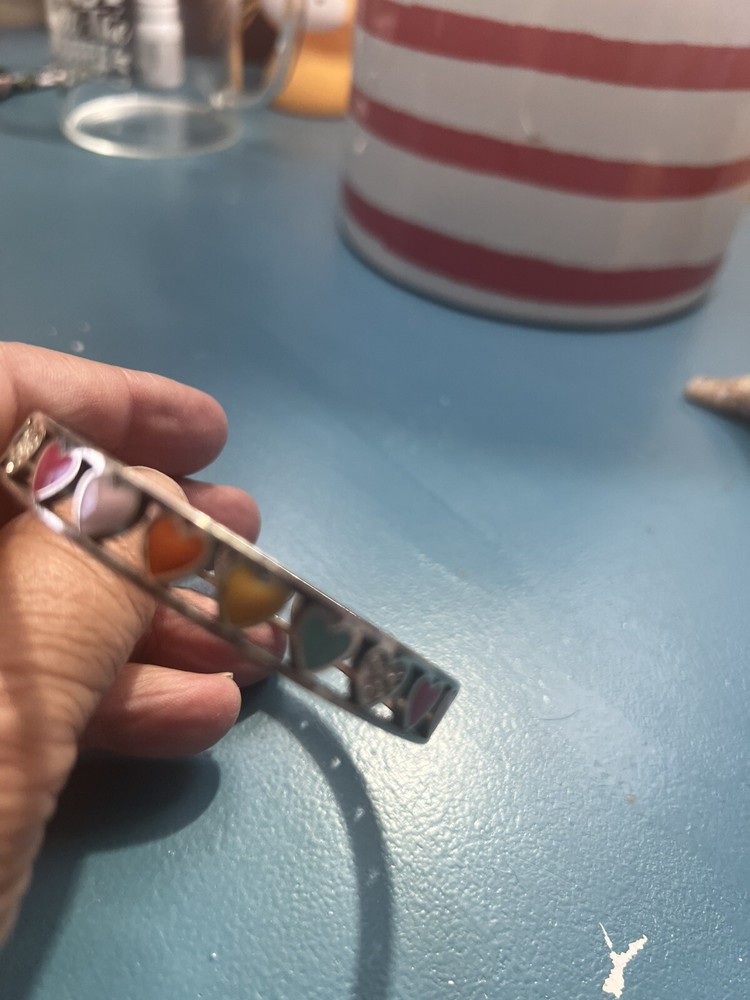 This Brighton Bon Bon Hearts Bangle Bracelet is a rare and retired piece perfect for Valentine's Day. The bracelet features a colorful enamel designcreating a lovely and festive look. With a bangle style and silver plated metal, this bracelet is designed for females and is a statement piece that exudes elegance and charm. Perfect for adding a pop of color and sparkle to any outfit, this Brighton bracelet is a must-have for any jewelry collection.