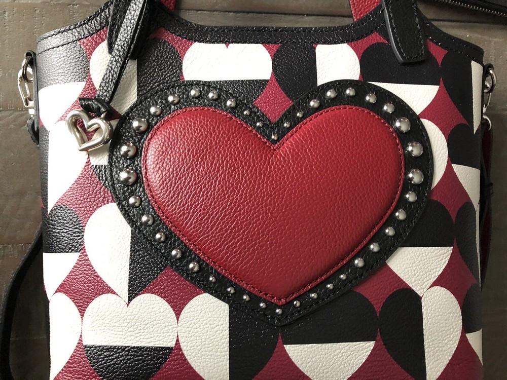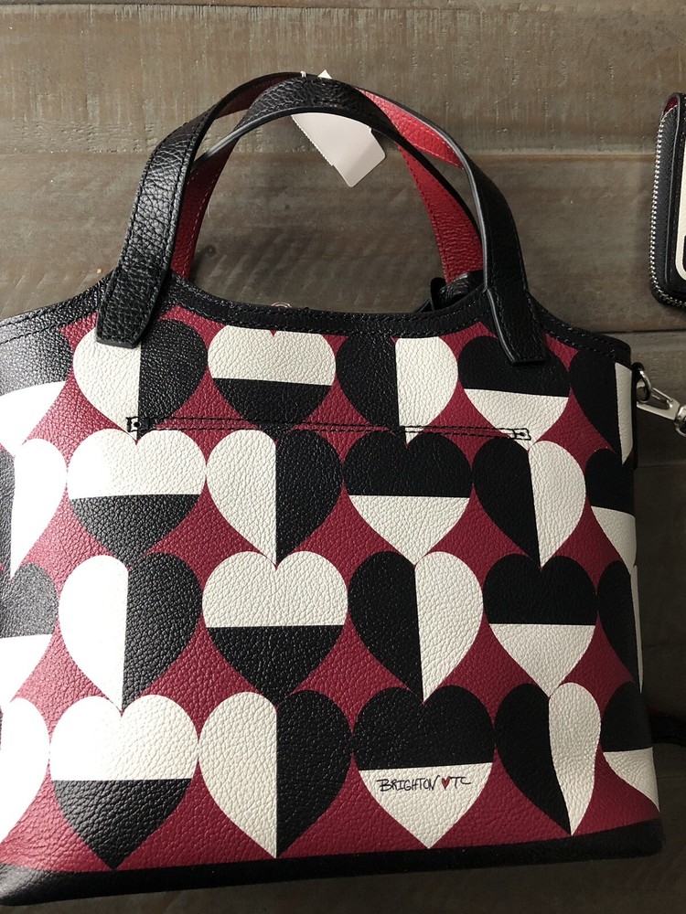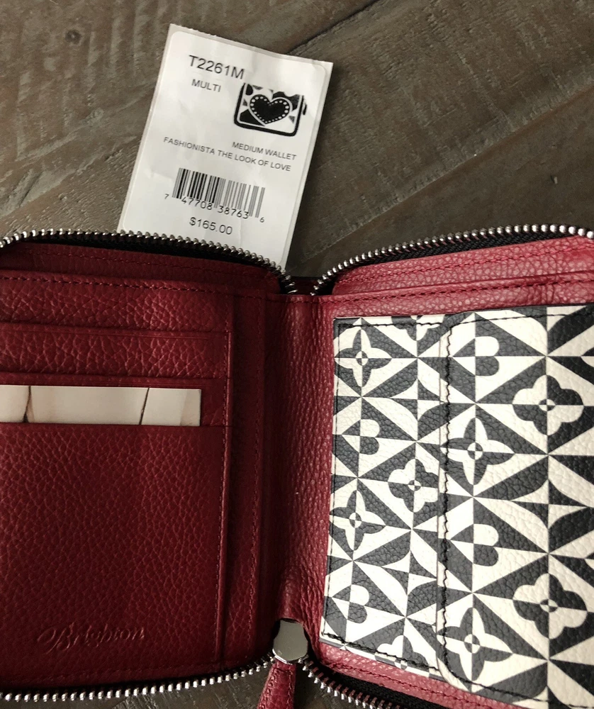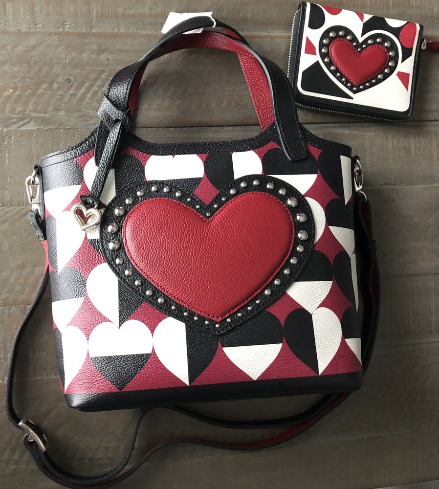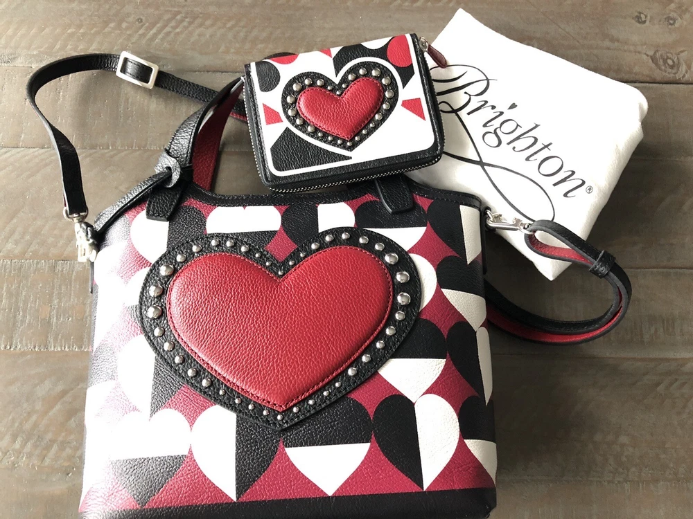 Brighton Fashionista Collection Look of Love Convertible Handbag and medium wallet!! Both brand new!! Small tote/crossbody Item Number H379M MSRP $410 New with Retail Tag Taking inspiration from the Op Art Movement of the 60s and 70s, Tom Clancy created this fresh and bold tote that will look great whenever and wherever you carry it. This limited-edition bag is part of the Brighton: Fashionista product line and has a love theme. Width: 9 1/2" Height: 8 1/2" Depth: 3 1/2" Closure: Magnetic Exterior Material: Leather Interior Lining: Polyester Interior Pockets: 4 Exterior Pockets: 1 Strap: 5" Handle Additional Strap: 24” to 48” Adjustable, Detachable Features: Key Holder/Studs Guaranteed authentic Brighton product purchased direct from Brighton Outlet. Serial numbers have been "x"ed out so item cannot be returned to a full price Brighton Salon. This is a loss prevention policy that is incorporated into handbags that are sent to the Outlet stores.
