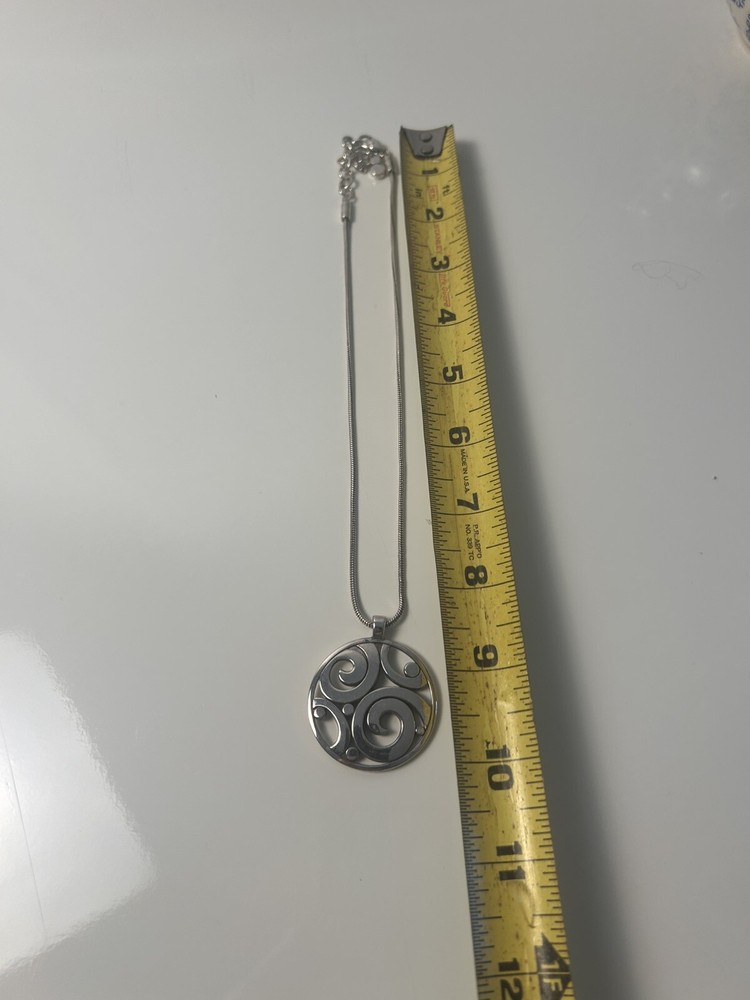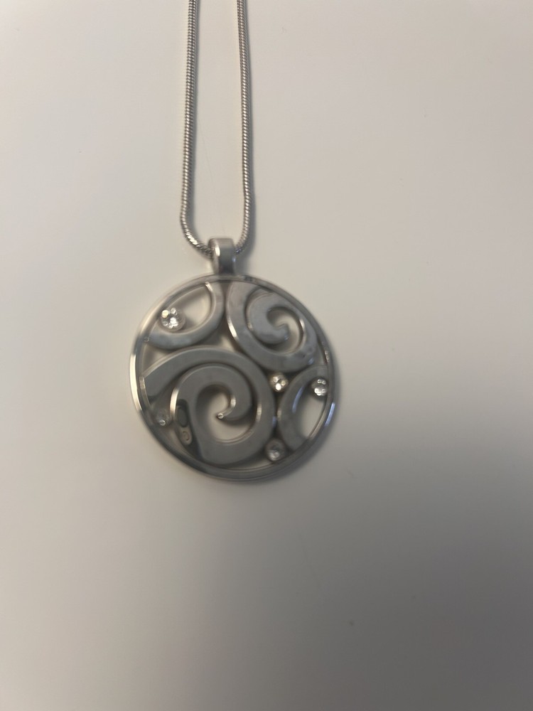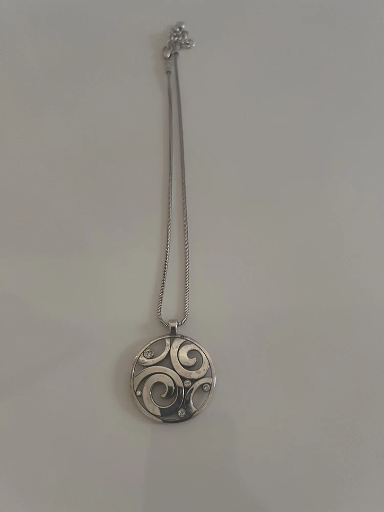 This Brighton London Groove Circle Pendant Necklace features sparkling crystals set in a round pendant design. The necklace is 16 inches in length, with the option to extend it to 18 inches for a customizable fit. The silver crystal pendant exudes a theme of love and is the perfect accessory for adding a touch of elegance to any outfit. Made in the United States, this necklace is a beautiful piece of fashion jewelry that embodies Brighton's signature style and quality craftsmanship.