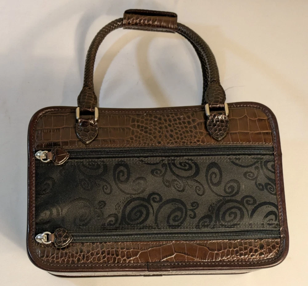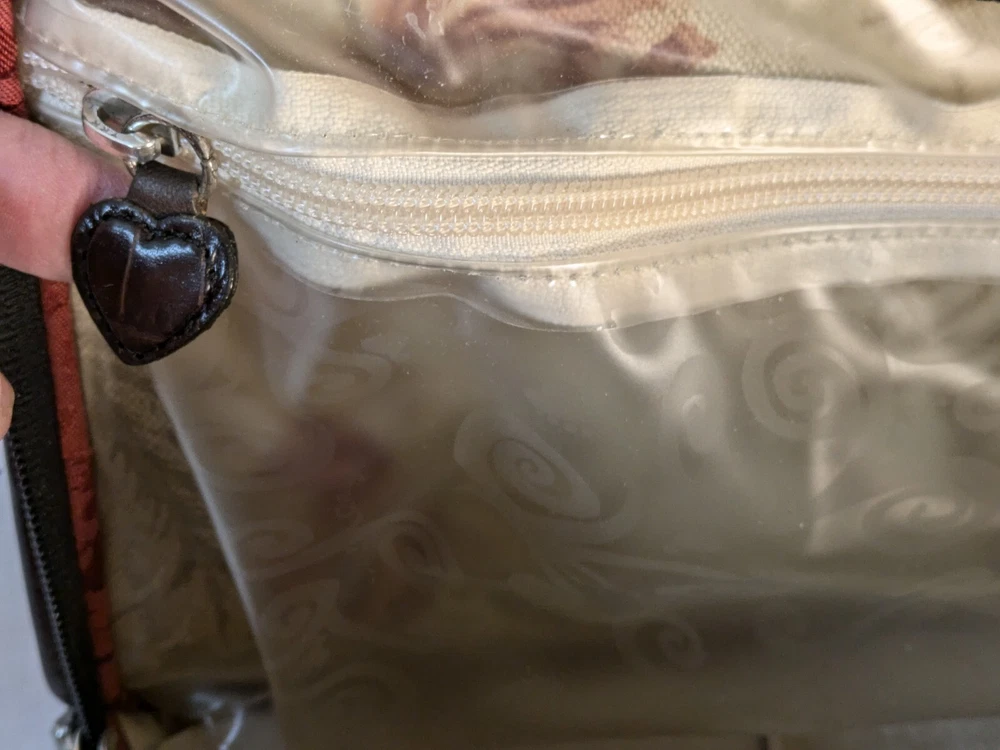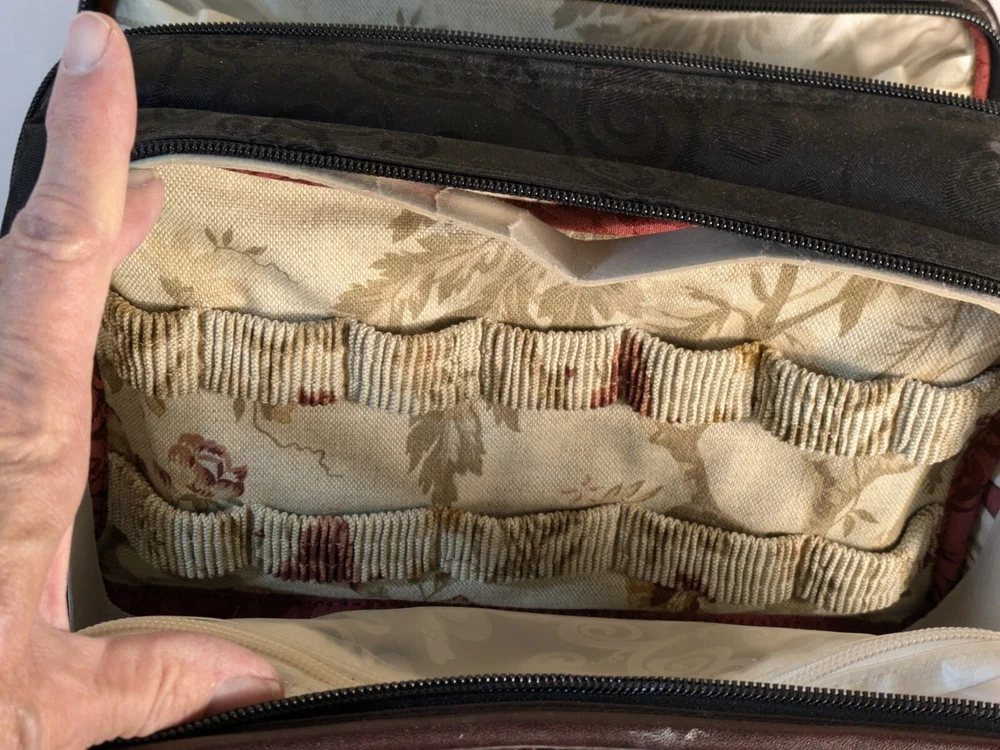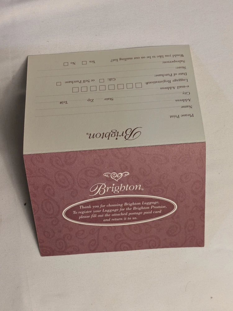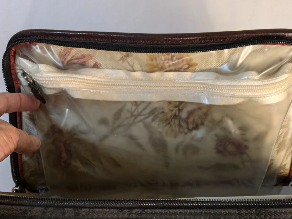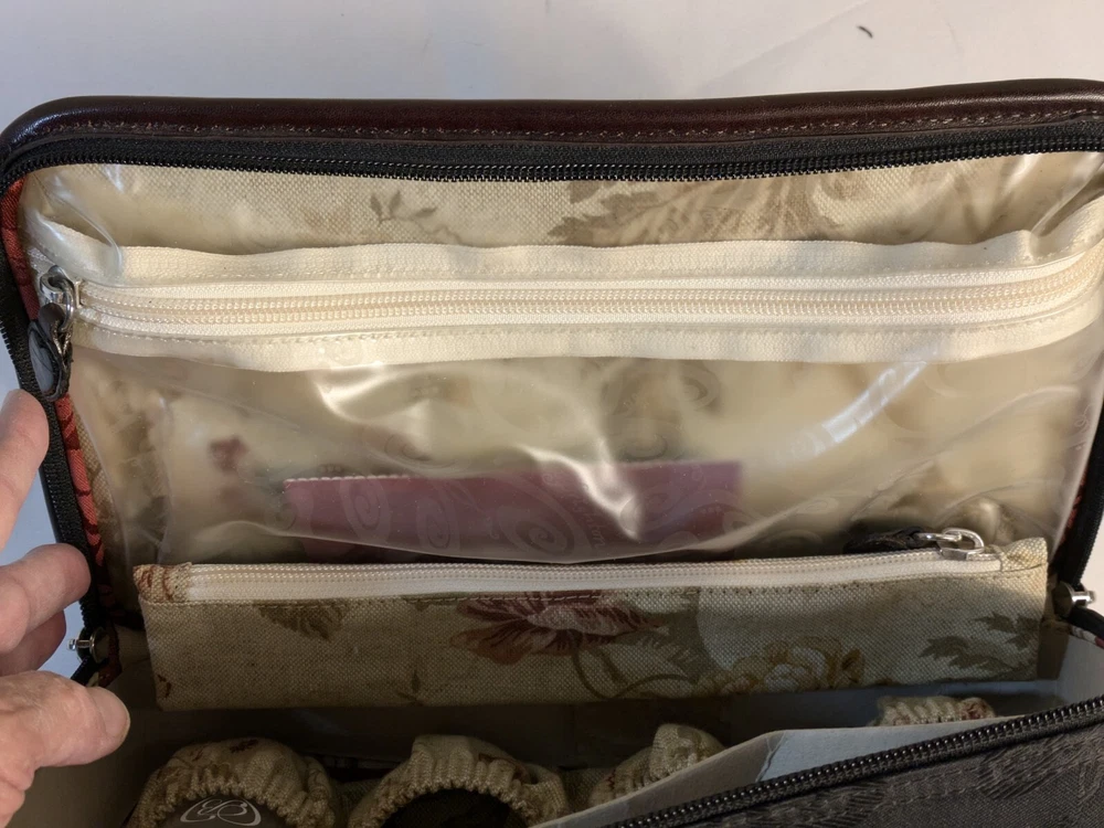 This bag is new and has never been used it still has the cardboard packaging bands. There's 3 bottles included that meet the size requirements for toiletries. The registration card is also included