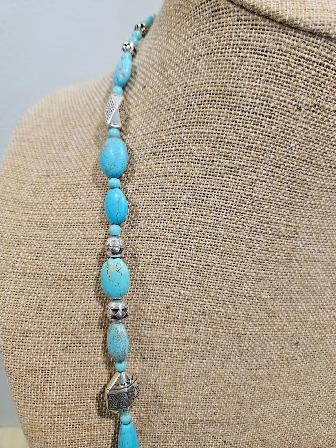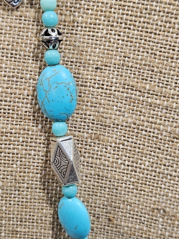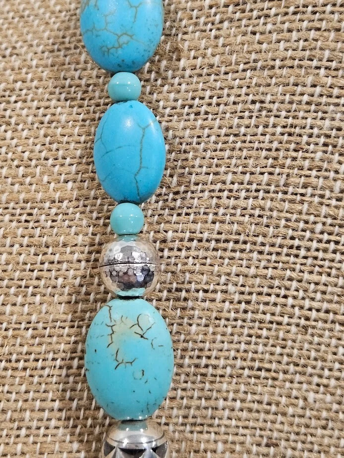 Brighton Mohave necklace. Turquoise-dyed semi-precious howlite beads, Silver plated Lobster Claw closure. Ships from a smoke free home! Please see all photos for exact item condition. Care for Brighton jewelry: gently wipe them clean with a soft cloth and mild soap solution. Avoid exposing your piece to harsh chemicals or abrasive materials, as these can damage the finish . Thank you for checking out my store! All items are shipped within 1 or 2 business days. Make a bundle to save on shipping cost.