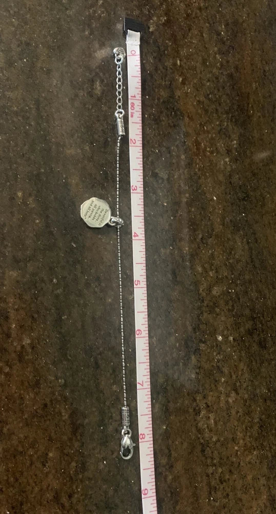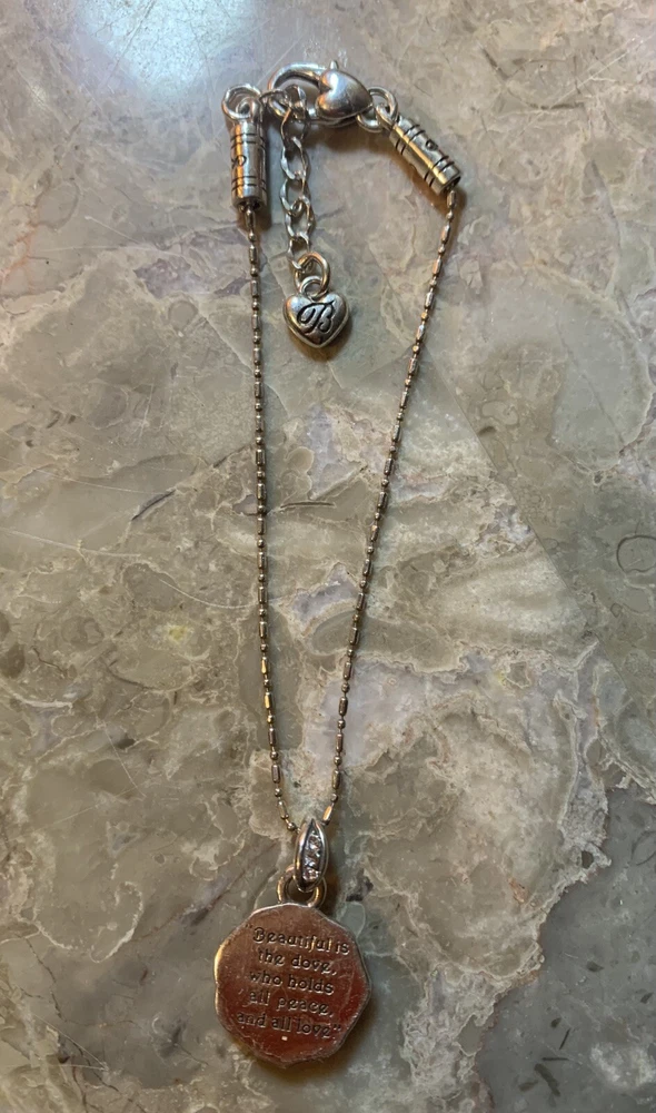 The Brighton Dove Charm Bracelet with Crystals is a beautifully crafted piece of jewelry that exudes peace and love. Silver plated and adorned with white/colorless crystals, this bracelet features a charming dove charm that adds a touch of elegance. The adjustable lobster closure makes it a versatile accessory suitable for various occasions such as Mother's Day, engagement, Christmas, wedding, anniversary, birthday, and Valentine's Day. The Brighton brand ensures quality and the piece is signed, giving it a touch of authenticity. Ideal for those who appreciate charm bracelets and love-themed accessories.