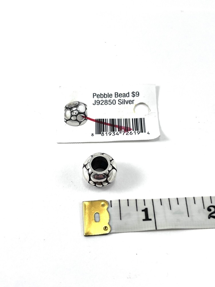 Add this beautiful Brighton Pebble Bead to your charm bracelet or necklace for a touch of elegance. The J92850 silver finish is stunning and new with tags, making it a great addition to your collection. With its round shape and beaded style, this charm bead is perfect for those who love charm jewelry. The Brighton brand is known for its high-quality and this charm bead is no exception. The silver plated material adds to its beauty and durability. Don't miss out on this great price for this charming piece of jewelry.