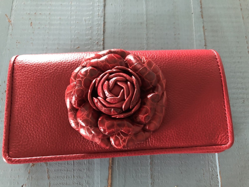 Brighton ROSIE ROCKMORE Wallet Lipstick Leather Rose Cross Body $235 NWT Style T35087 Regular price $235 Rosie Rockmore Wallet- Large Wallet Adorned with a handcrafted rose, this wallet is so lovely, we included a chain strap so you can carry it alone as an evening bag if you'd like. Exterior Material Leather Closure Snap Exterior Pockets 1 Credit Card Slots 5 Length 24" Width 7 1/2" Height 4" Depth 1" Weight 0.606