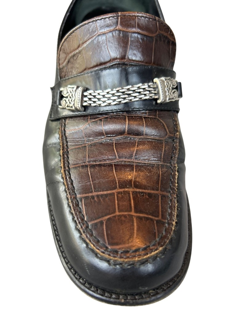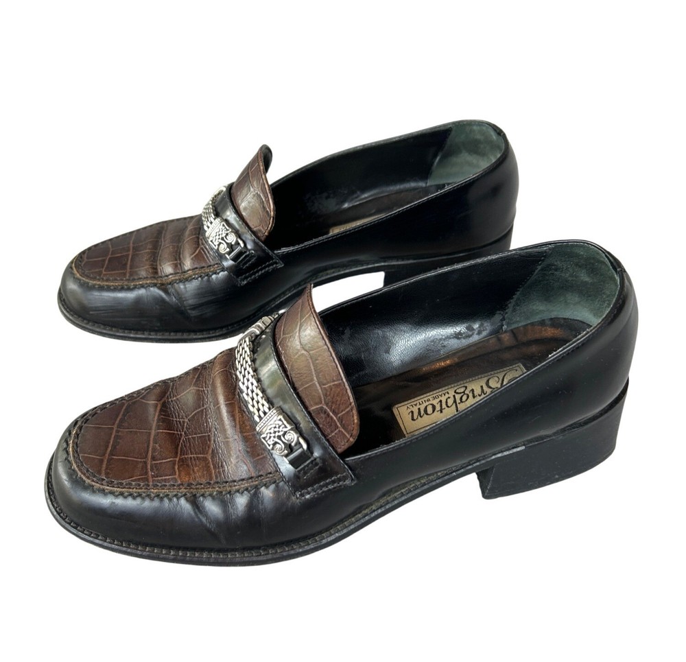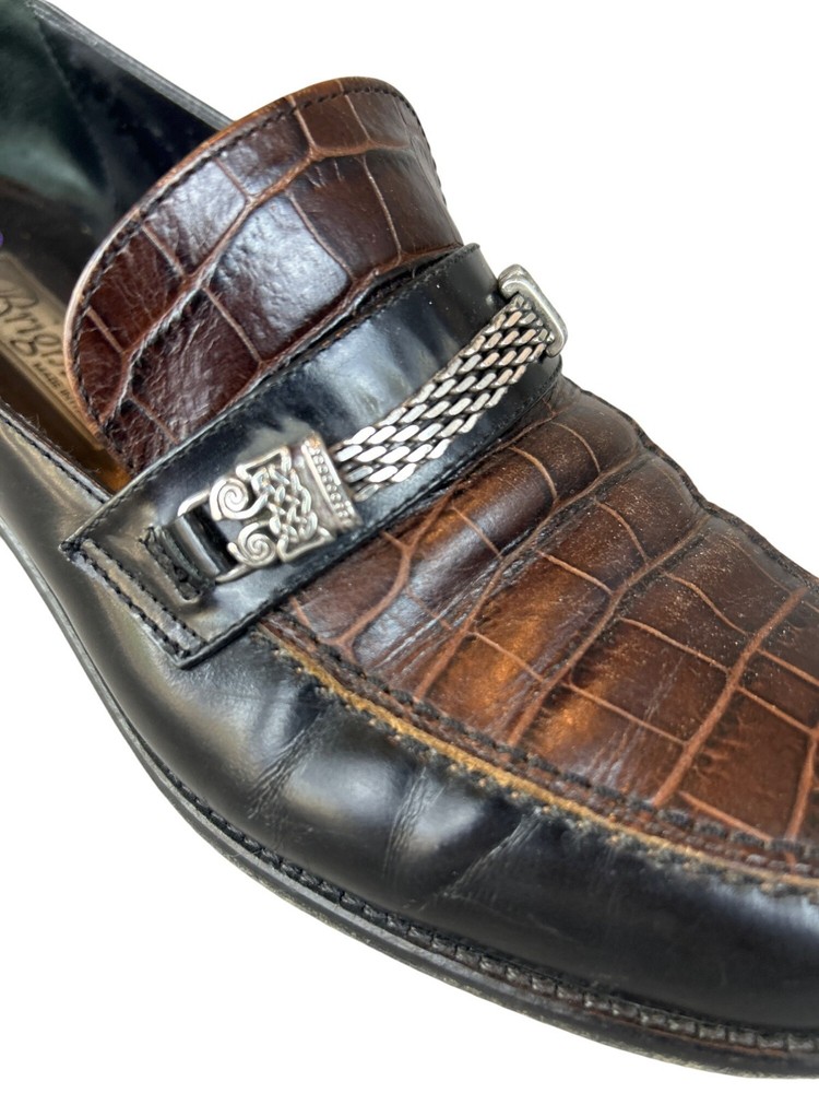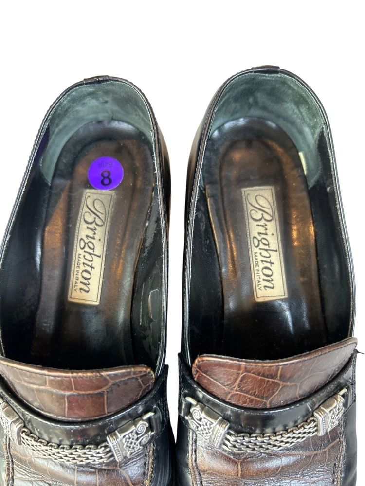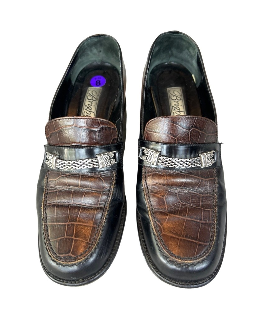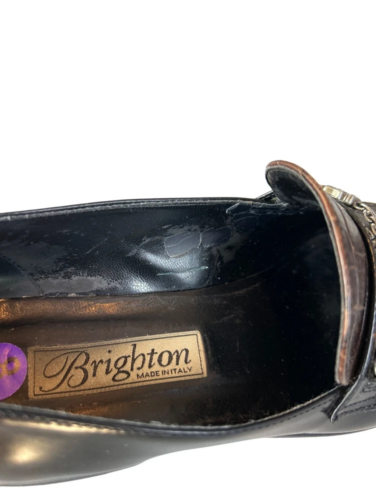 Brighton Dawn Brown Black Italian Croc Embossed Heeled Loafers Size: 8 Condition: Pre-Owned Good The Brighton Women's Dawn Brown Black Italian Croc Embossed Heeled Loafers Size 8 are stylish and versatile shoes perfect for both casual and business occasions. Made from high-quality leather with a slip-on closure, these loafers feature a round toe shape and animal print pattern in black. The heeled loafers have a comfortable medium width and are designed by Brighton, showcasing a chic and sophisticated style. Perfect for adding a touch of elegance to any outfit, these loafers are a must-have for any woman's wardrobe.