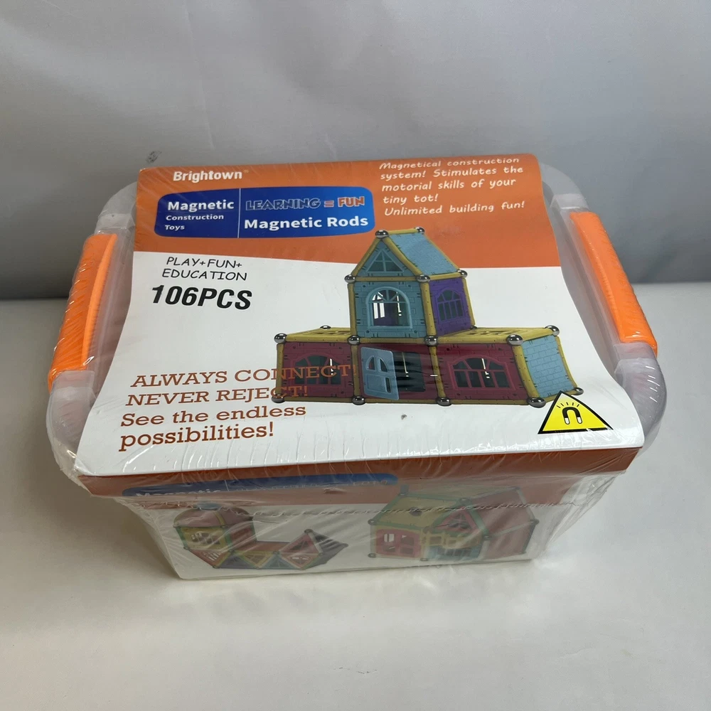 Brightown Magnetic Construction Toys Building Tiles Rods 106 PCS With Case Tote. New item with manufacturer’s packaging still attached. Please review all photos carefully before ordering.