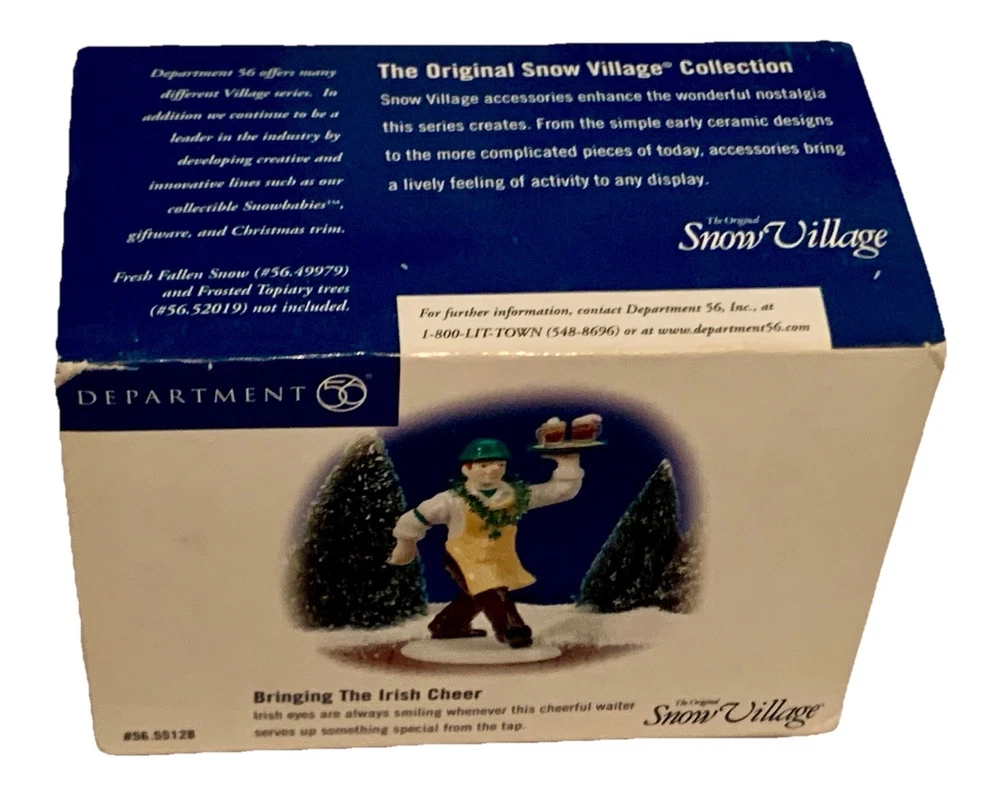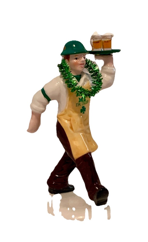 The product is a small ceramic and porcelain Christmas village from Department 56's The Original Snow Village collection. This particular piece is themed around Irish cheer, making it a festive addition to any holiday decor. Packaged in a box, this original piece features a glossy finish and represents the time period manufactured between 2000-2009. Perfect for adding a seasonal and food & drink theme to your Christmas display, this Irish-themed village is sure to bring a touch of charm to your home.