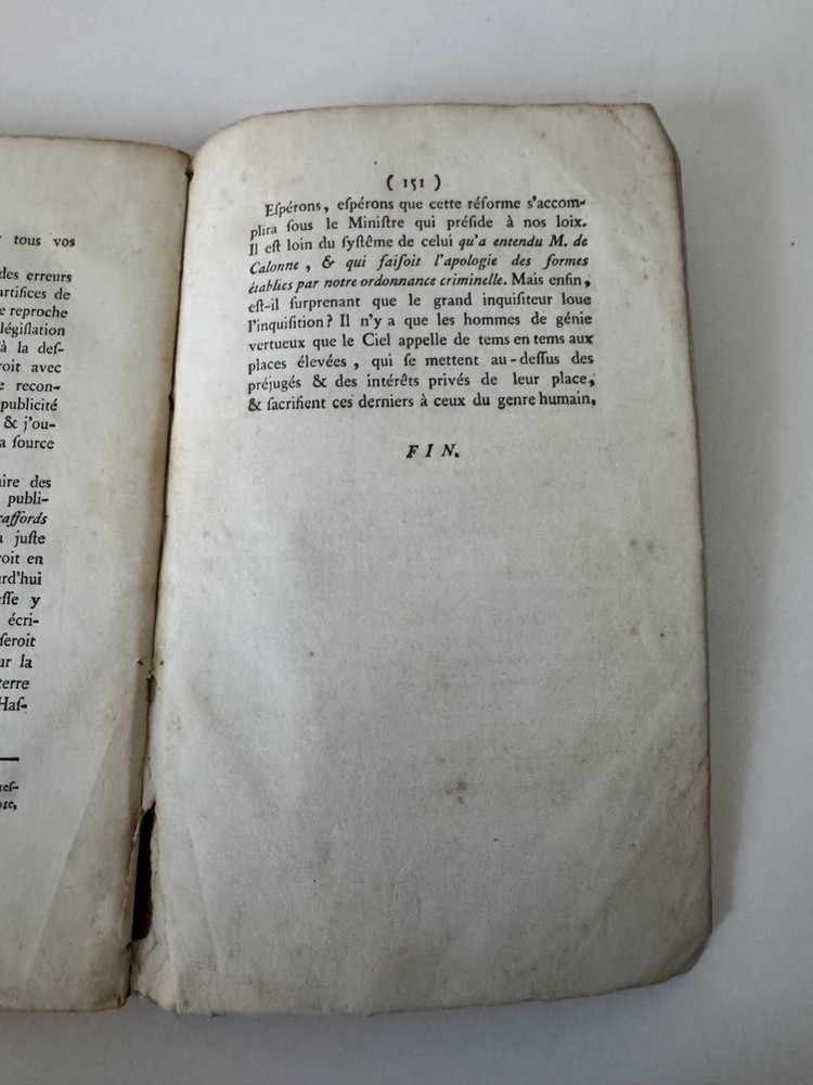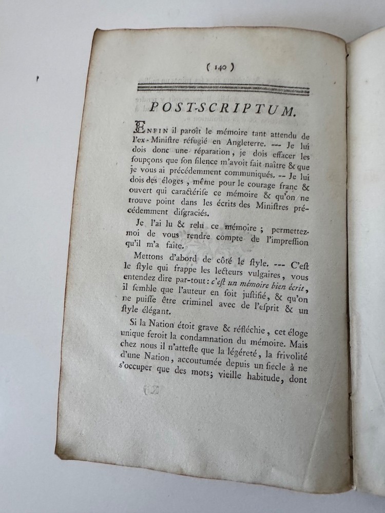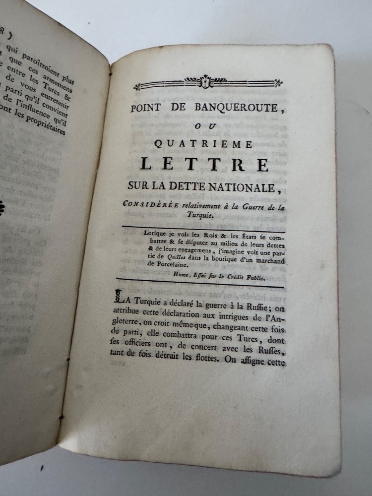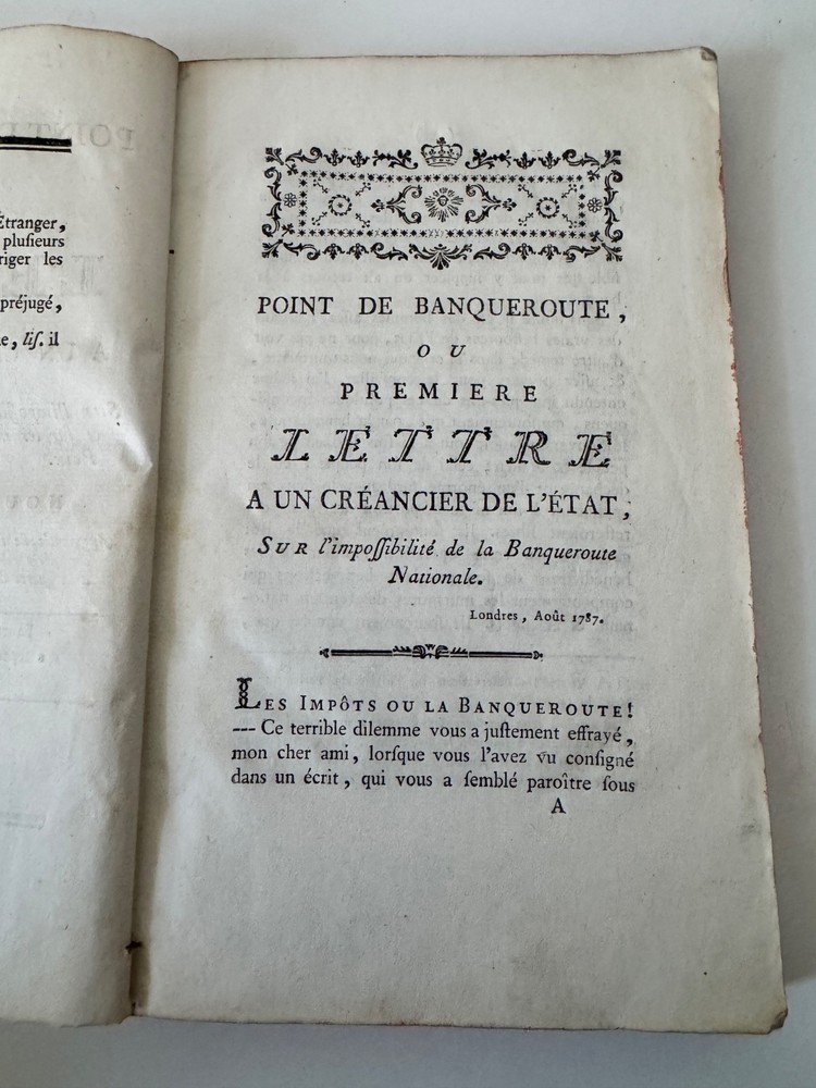 ( Brissot De Warville, Jacques-Pierre ) Point de Banqueroute, ou Lettre à un Créancier de l'Etat, sur l'impossibilité de la Banqueroute Nationale, & sur les moyens de ramener le Crédit & la Paix. Nouvelle édition complète des quatre Lettres et d'un Post Scriptum. La première édition ne comprend que 40 pp. Londres, Octobre 1787. In-8 de 151 pp., broché non rogné sous couverture d'attente. L'année 1787 marque un moment climatérique dans la crise de l'Ancien Régime et les prodromes de la Révolution. Face au déficit financier et à la situation de quasi banqueroute de l'État, Louis XVI convoque l'Assemblée des Notables de laquelle Calonne, Contrôleur général des finances, espère l'approbation de mesures d'urgence. Mais les Notables refusent de les entériner, prétextant que seuls les États généraux sont compétents en la matière et Calonne est remercié en avril. L'aristocratie, à travers les parlements s'oppose à toute réforme de la fiscalité défendue par les ministres du roi. Le duc d'Orléans, futur Philippe-Égalité, prend alors la tête de cette fronde au parlement de Paris, ce qui lui vaudra d'être exilé sur ses terres en novembre. Jacques-Pierre Brissot (1754-1793) est alors un des conseillers politiques du duc d'Orléans. La brochure qu'il publie à Londres en août 1787 reflète donc les convictions de cette opposition : refus de toute banqueroute, mais aussi de soutien au gouvernement, demande de convocation des États-généraux et également de la suppression des lettres de cachet. De manière usuelle en ces années pré-révolutionnaires, la sauvegarde des acquis des élites nobiliaires et parlementaires s'habille d'une défense des "intérêts" de l'opinion publique