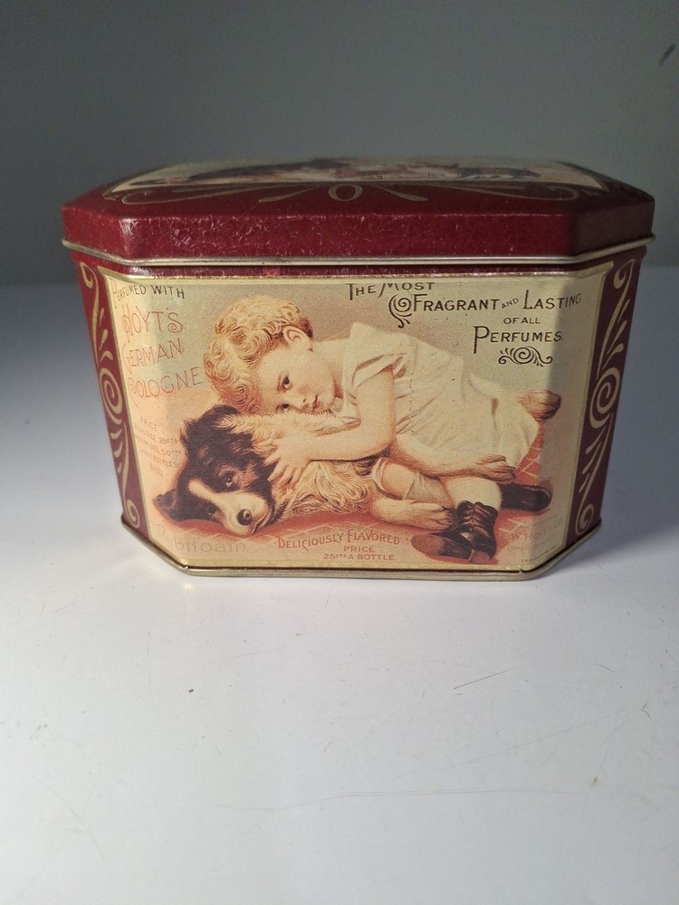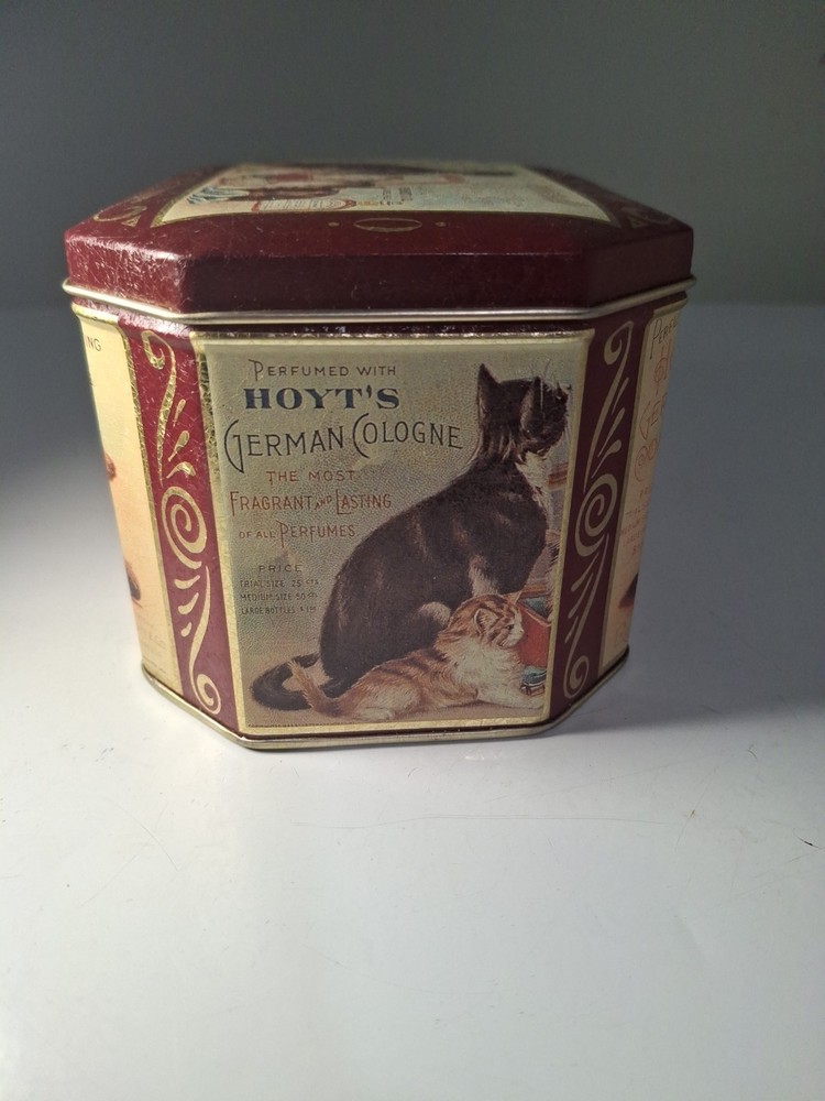 The Bristol Ware Hoyt's German Cologne Metal Tin is a charming collectible item featuring a whimsical design of cats, a dog, and a child. Made by Bristol Ware, the tin showcases a multi-color palette that adds a playful touch to its appearance. Perfect for collectors of advertising and merchandise memorabilia, this tin is a unique and eye-catching piece that would make a lovely addition to any collection. In excellent condition.