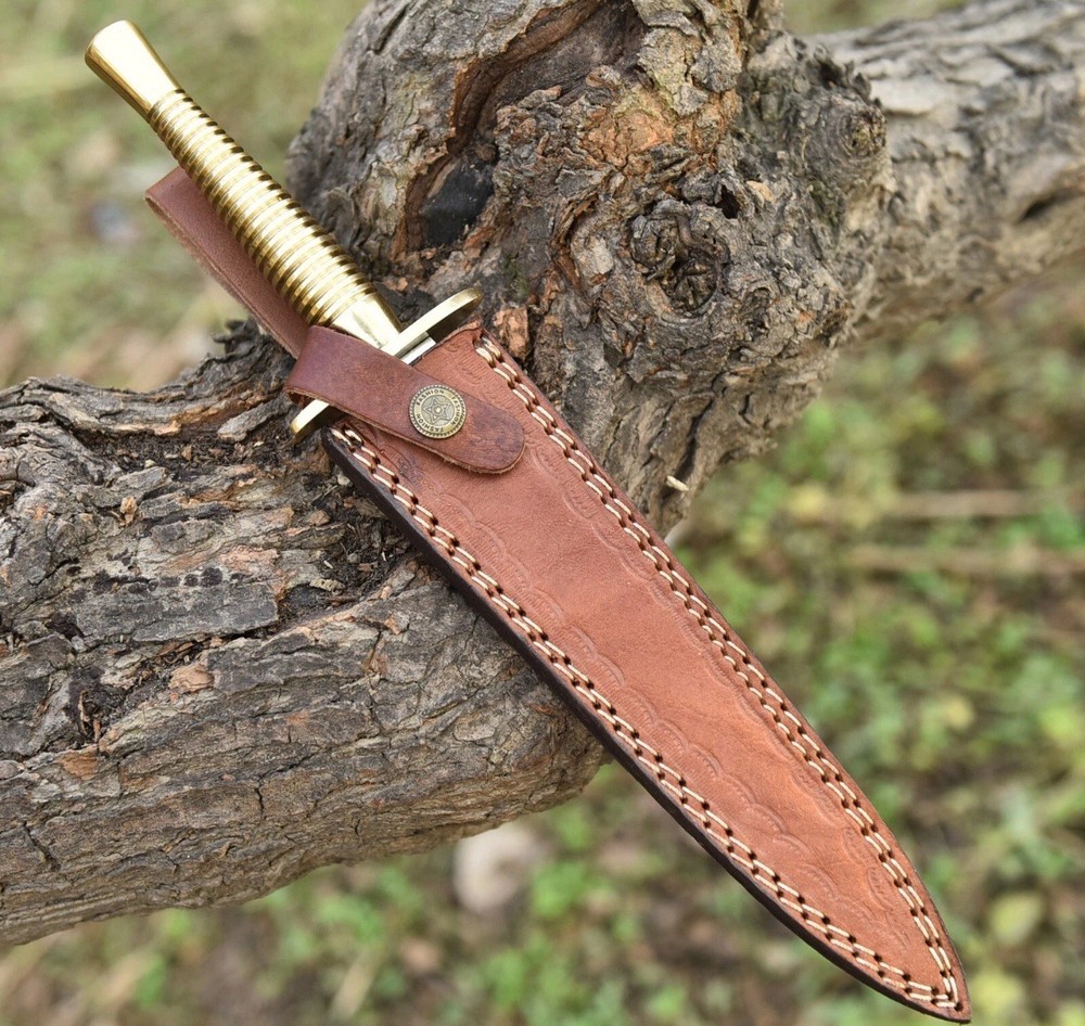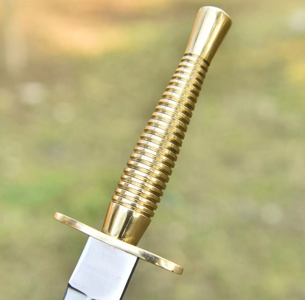 British Army Fairbairn-Sykes Commando Knife – 3rd Pattern Brass Handle with Leather Sheath Overall Length: 13 Inches | Blade Length: 8 Inches A legendary blade with roots in World War II history, the Fairbairn-Sykes Commando Knife is a symbol of elite military craftsmanship. This 3rd pattern replica stays true to the original design, featuring a distinctive solid brass handle with ringed grip for enhanced control and balance. The 8-inch double-edged high carbon steel blade tapers to a fine point, ideal for precise thrusting. A traditional blued finish adds both corrosion resistance and a non-reflective surface, making it suitable for tactical use. Includes a handcrafted leather sheath with secure snap strap and belt loop, perfect for field or display. Specifications: • Overall Length: 13 inches • Blade Length: 8 inches • Handle: Solid brass, ringed grip (3rd pattern design) • Blade: Double-edged, high carbon steel • Sheath: Genuine leather with belt loop • Style: Military/WWII British Commando Replica Perfect for military collectors, history enthusiasts, and knife aficionados.