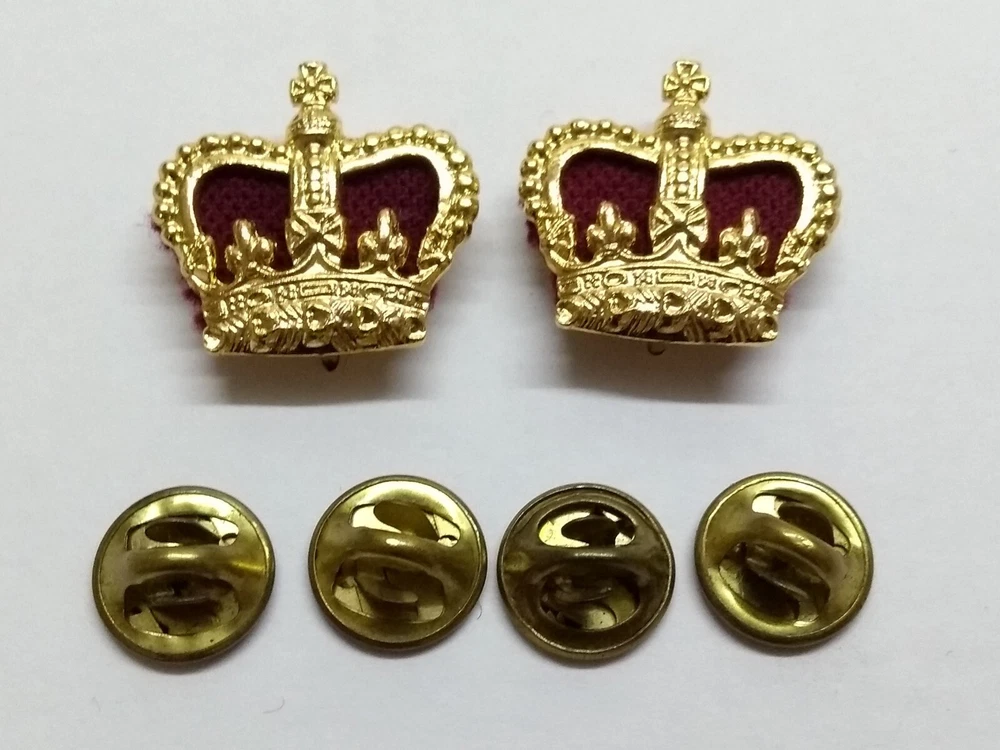British Military Crowns Rank Insignia Royal Crown With Red Cushion & Clutch Pins 1pair of small British rank crowns (gold colour). This listing is for a pair of badges. Great for customization, costumes or collectors. Condition: New Size: 22.3mm X 21.2mm Approx Photos are stock photos colour shades may differ Please contact me for any further information. Thanks for looking