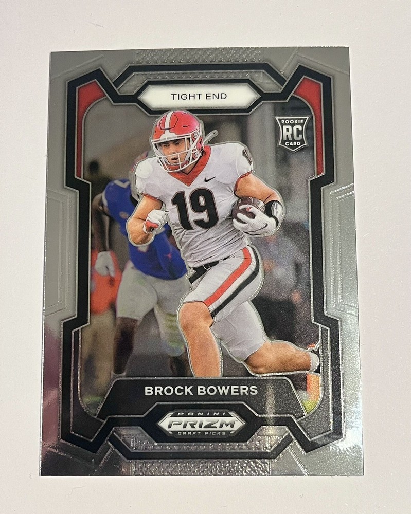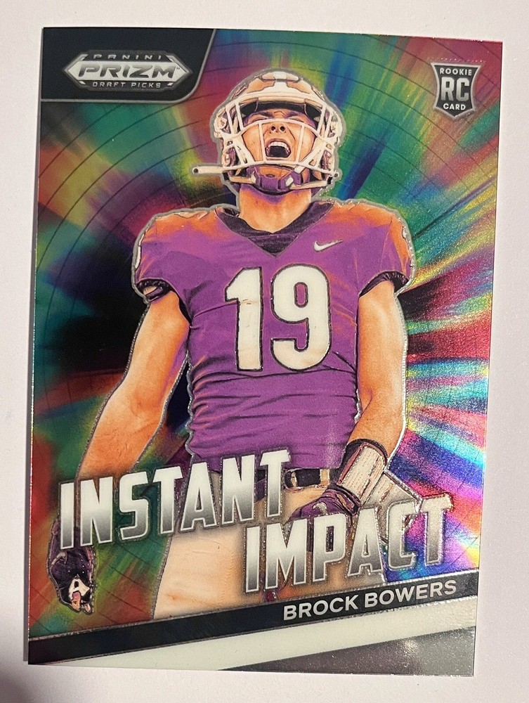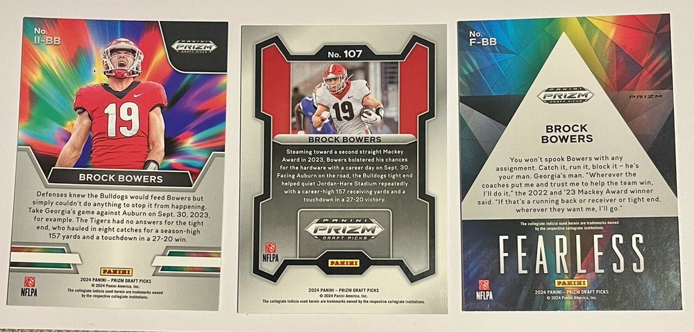 This is a lot of 3 Brock Bowers 2024 Panini Prizm Draft Picks football trading cards featuring prism insert rookie cards. The cards are from the National Football League (NFL) and are part of a limited edition collectors' set. They are original, licensed reprints by Panini, with hologram and short print features. The cards are in English and manufactured in the United States, showcasing the Las Vegas Raiders player in his rookie season. Brock Bowers Lot Of 3 Panini Prizm Draft Picks Instant Impact Insert Fearless Insert Red Refractor Prizm Draft Picks RC. NFL ROTY Brock Bowers Prisms Insert RC