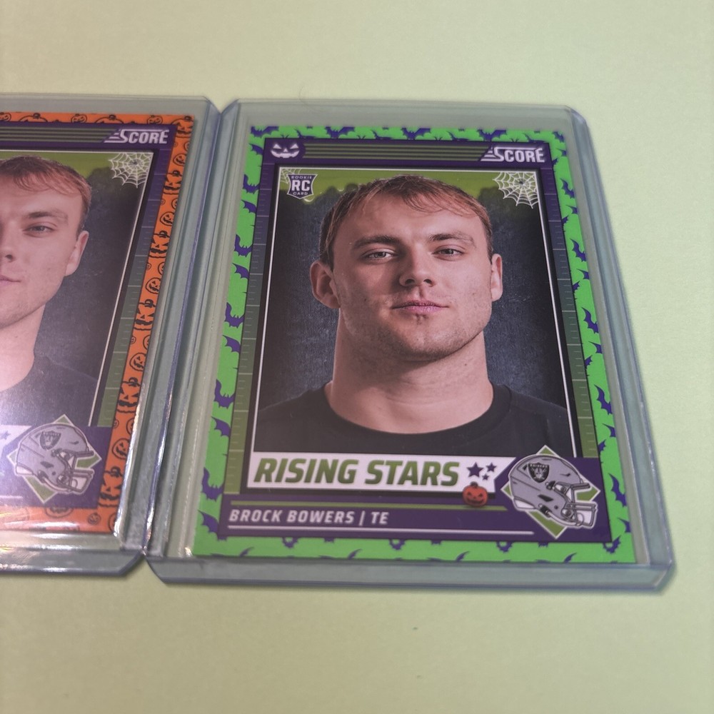 Get your hands on this amazing Brock Bowers 2 Rookie Orange & Green Raiders Bats Pumpkins Combine Ship+ Coupon trading card set from the 2024 Panini Score A Treat collection. This set features two cards with the talented football player and is perfect for any fan of the National Football League (NFL). The cards are manufactured by SCORE and are sure to impress with their unique design and quality. The set includes everything you need to complete your collection and features the rookie season of Brock Bowers. This is a must-have for any sports trading card enthusiast and is perfect for adding to your collection or gifting to a fellow football fan. Don't miss out on this opportunity to own a piece of football history!