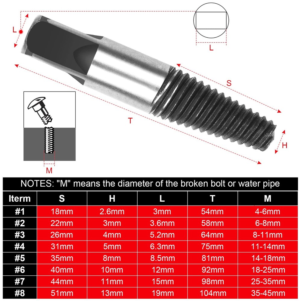 【Reliable Quality】The broken water pipe extractor is made from heavy duty alloy steel, black oxidation with whole body heat treatment, rustproof and sturdy, ensure high hardness and durability, eight different sizes of extractors,basically can meet all the needs of removing debris. 【Square Shank & Deep And Wide Threads】The broken water pipe screw extractor with square end design, allows the extractor to work with wrenches, pliers, tap wrenches or die stocks, aggressive left hand spiral design, easy out style spiral flutes embed themselves to increase grip as resistance increases. 【Easy To Use】Use a drill to drill a deep hole in the screw head, choose a drill bit smaller than the damaged screw, and then reverse the screwdriver counterclockwise into the damaged screw, the operation is convenient and simple,saving a lot of time and energy. 【Eight Size To Choose & Storage Box】8 pcs pipe screw extractor set, #1 for 1/8''-5/32'', #2 for 5/32''-3/16'', #3 for 3/16''-1/4'', #4 for 1/4''-5/16'', #5 for 5/16''-7/16'', #6 for 7/16''-9/16'', #7 for 9/16''-3/4'', #8 for 3/4''-1'', come with a molded box, keep these extractors organized, clean, secure and easy to find. 【Widely Application】The water pipe screw extractor set can remove sunken,peeled,rusted,cracked or corroded screws and bolts,remove broken fasteners, suitable for screws or bolts of various sizes,such as hexagon socket bolts,machine screws,square head bolts,wood screws,hexagon screws,sheet metal screws, are ideal for construction, automotive, home diy projects or for industrial use.
