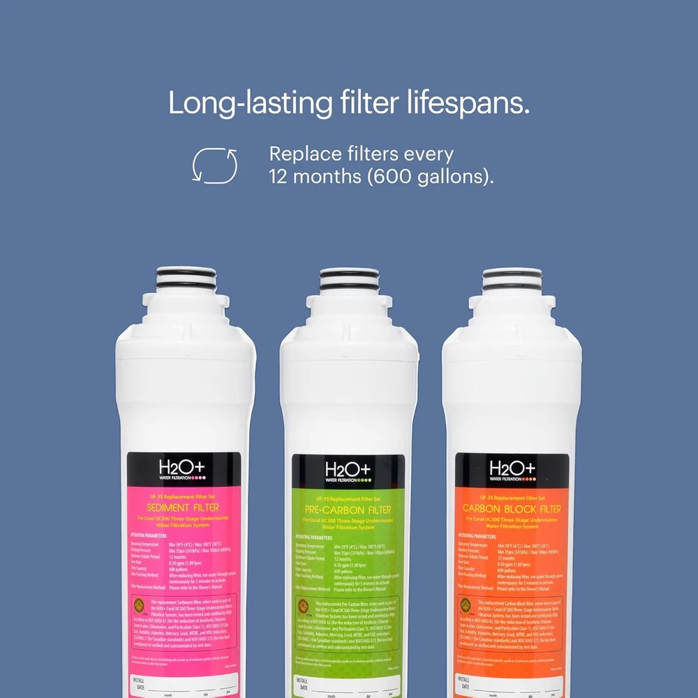Brondell H2O+ Coral UC300 Three-Stage Undercounter Water Filtration System (UF-35 Replacement Filters) Product Details Is Discontinued By Manufacturer : No Product Dimensions : 24.38 x 34.04 x 14.99 inches; 1.5 Pounds Item model number : UC300 Manufacturer : Brondell Country of Origin : USA Brand: Brondell Special Feature: Easy to Install Product Dimensions: 24.38"L x 34.04"W x 14.99"H Package Information: Bottle Installation Type: Under Sink Power Source: Manual Operation" Or "Na Item Weight: 1.5 Pounds Model Name: UC-300 Maximum Flow Rate: 0.5 Gallons Per Minute Shelf Life: 12 Months MaterialCapacity: UF-35 Replacement filters600 Gallons Included ComponentsPurification Method: Water Purifier with Designer Chrome FaucetActivated Carbon THREE-STAGE FILTRATION: Brondell’s Coral Three-Stage filter set consists of a sediment filter, pre-carbon filter, and carbon block filter. Get rid of physical, chemical, and biological contaminants in your water while leaving behind beneficial minerals. REPLACEMENT WATER FILTER: This sediment and carbon block filter replacement is specifically for the Brondell Coral Under Sink Water Filter (sold separately); It is designed for easy installation, providing great-tasting water for up to 12 Months 3-STAGE CARBON FILTRATION: The sediment filter reduces rust, sand, and particulates; The carbon pre-filter reduces VOCs, chlorine, and other contaminants; The carbon block filter further decreases chemicals, bad tastes, smells, and heavy metals SIMPLE DIY INSTALLATION: The replacement filter can be installed in just a few minutes with a quick and easy twist and seal installation; The change indicator lets you know when a new filter is needed; Includes filter indicator replacement battery