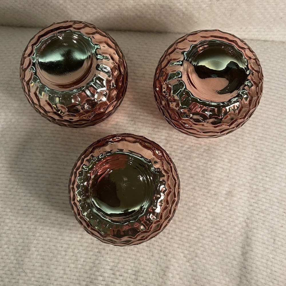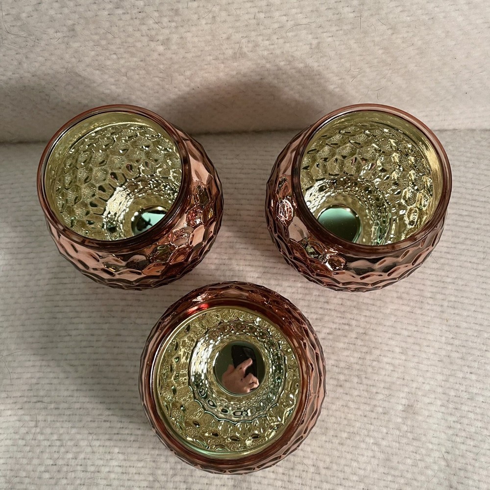 Add a touch of modern elegance to your decor with this set of three bronze and gold glass votive holders. The round shape and fingerprint pattern make them a unique addition to any collection. These holders are suitable for mini candles and are perfect for creating a warm and cozy atmosphere. The glass material adds a sleek touch and the bronze-gold color complements any decor. These candle holders are a must-have for anyone who loves to collect decorative items. Excellent condition . No chips or cracks.