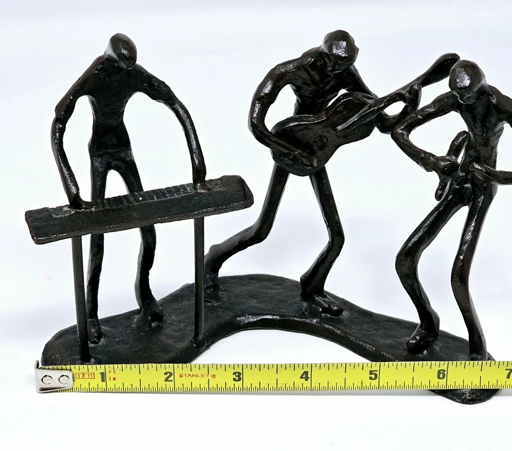 Great condition, no damage seen. Bottom has a protective cloth to prevent scratching on surfaces. This stunning sculpture is a must-have for any art lover or music enthusiast. Crafted from high-quality bronze, this small statue captures the essence of a guitar player, pianist, and singer in a brutalist style that is both unique and striking. Measuring 5 inches in height and 7 inches in length, this sculpture is perfect for display in any space. The intricate details and impressive artistry of this piece make it a true collector's item. Whether you're looking to add to your collection or simply want to enjoy the beauty of this sculpture, it's sure to impress. So why wait? Add this remarkable piece to your collection today!