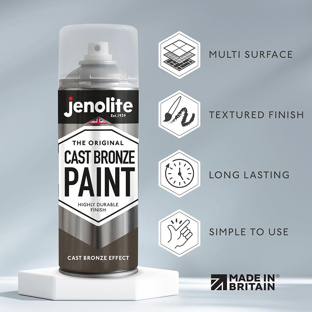 Cast Bronze Effect Spray Paint has been formulated to recreate the look and feel of cast bronze. The matt finish is lightly textured, to give the realistic look and feel of cast bronze. Suitable for interior and exterior use, it is ideal for use on ornaments, garden pots, railings, garden furniture & decorative features. The multi surface paint is suitable for wood, metal, plastic, ceramic, terracotta, cast concrete, etc. It provides an attractive and long lasting finish that is weather and UV resistant. Available in a range of effects. CAST BRONZE: Realistic Cast Bronze Effect Spray Paint - Matt Finish TEXTURED FINISH: Gives realistic look and feel of cast bronze MULTI SURFACE PAINT: Can be used on metal, wood, plastic, ceramics, terracotta, cast concrete, etc USAGE: Ideal for use on ornaments, garden pots, railings, garden furniture & decorative features LONG LASTING: All weather finish - UV and corrosion resistant SIMPLE TO USE: Easy application and quick drying MADE IN BRITAIN