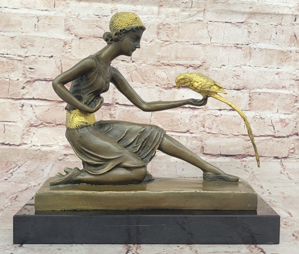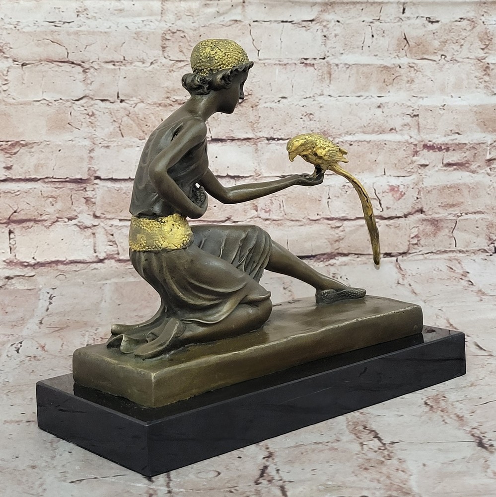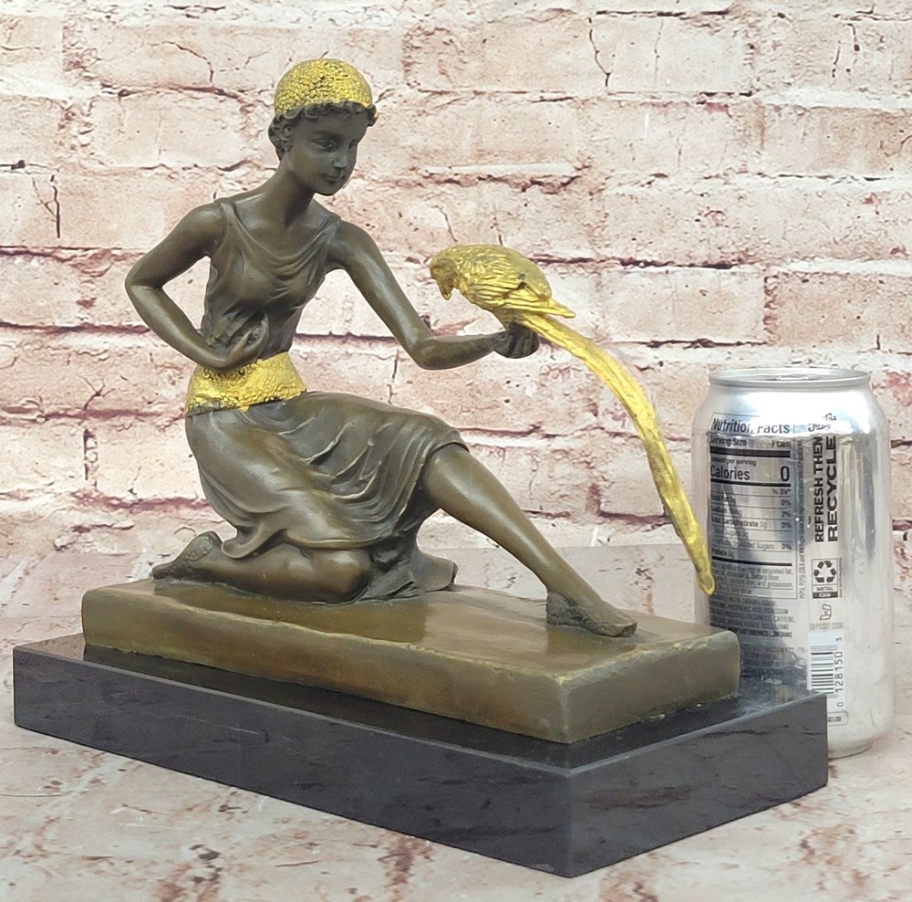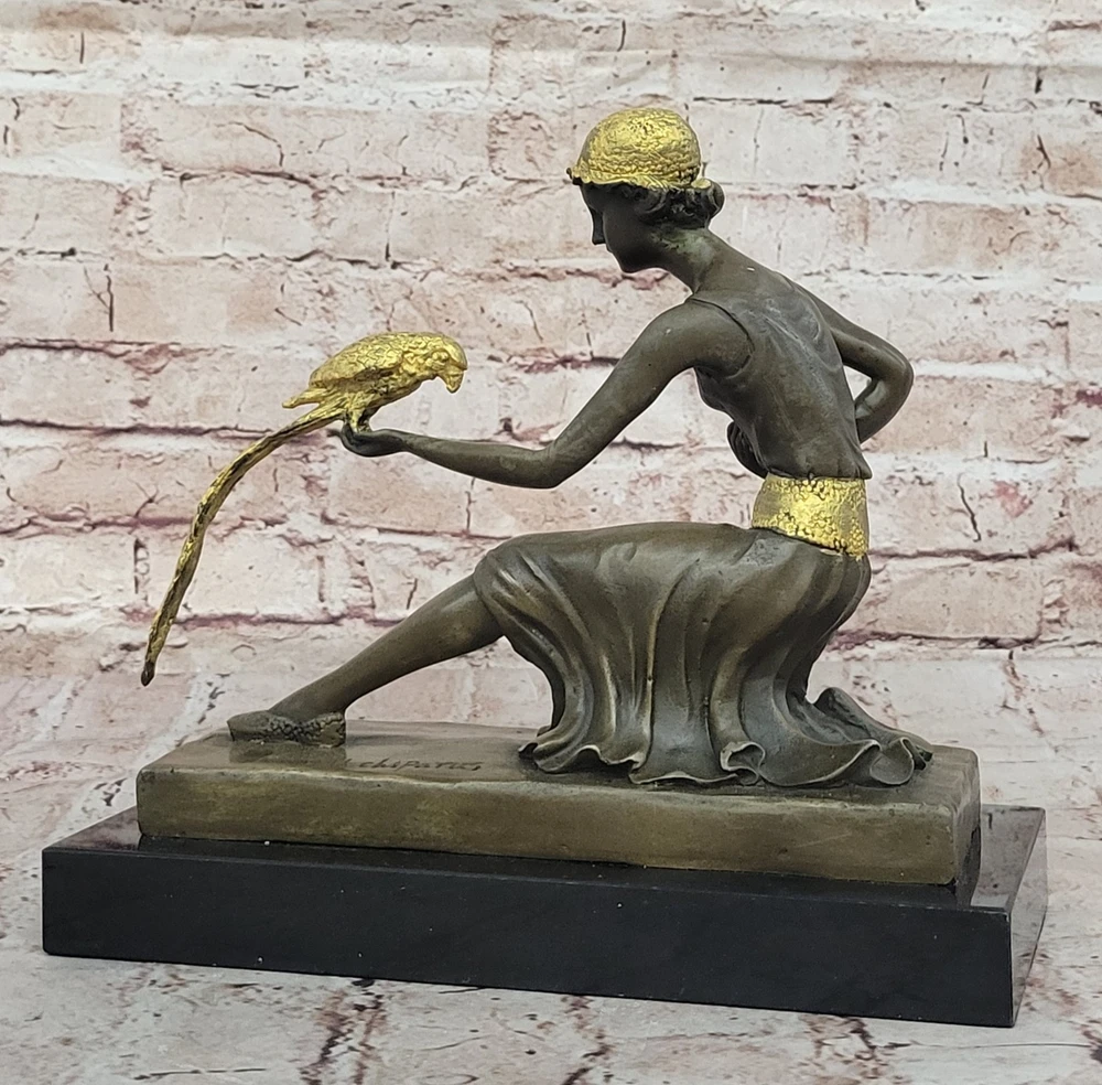 Condition : This sculpture is in perfect condition. Bronze Dimensions with Marble Base: Height 10" x Width 10" Marble Dimensions: 10" X 4 1/2" Height without base: 9" Weight: 12 LBS Inventory: 29DS1484292 Immerse yourself in the world of elegance and exoticism with this enchanting bronze sculpture titled "The Bird Whisperer," crafted with meticulous detail by the renowned artist Chiparus. This exquisite piece brings to life a scene of sophistication, as a well-dressed woman engages with an exotic parrot. Every element, from the vibrant patina on her golden dress to the intricate details of the parrot's colorful plumage, is a testament to the artist's exceptional skill and creativity. Using the time-honored "Lost Wax Method," this sculpture captures the essence of the moment in exquisite bronze. The golden dress and silver accessories of the woman shimmer with a touch of opulence, while the parrot's vivid colors add vibrancy and vitality to the composition. Mounted on a sleek black marble base, this sculpture exudes elegance and sophistication, making it a captivating addition to any art collection or interior decor. For art enthusiasts and nature lovers alike, "The Bird Whisperer" offers a harmonious blend of beauty and exotic charm. Signed by the artist Chiparus, this bronze sculpture is a timeless masterpiece that invites you to appreciate the artistry and grace of the human form in communion with nature's vibrant beauty. Bronze Art Nouveau Deco Sculpture Deco Girl w/ Parrot by Chiparus Home Decor DS-148BG Video will open in a new window Using the eBay App? Paste link into a browser window: [isdntekvideo]