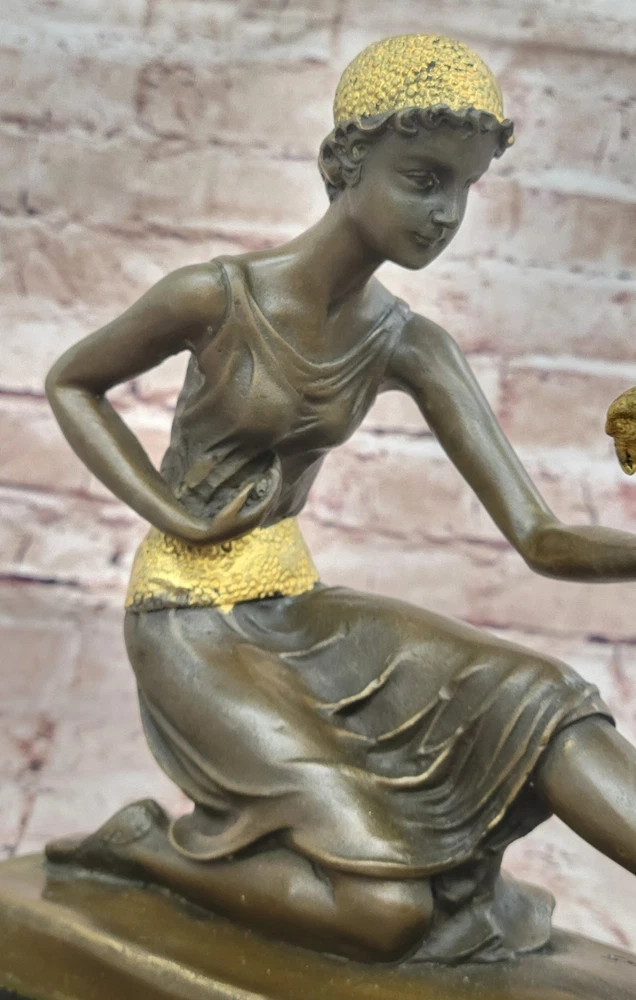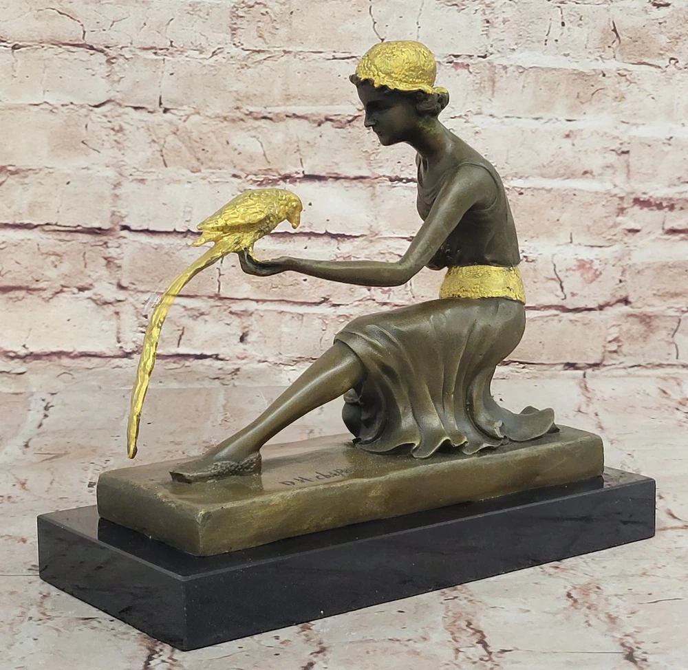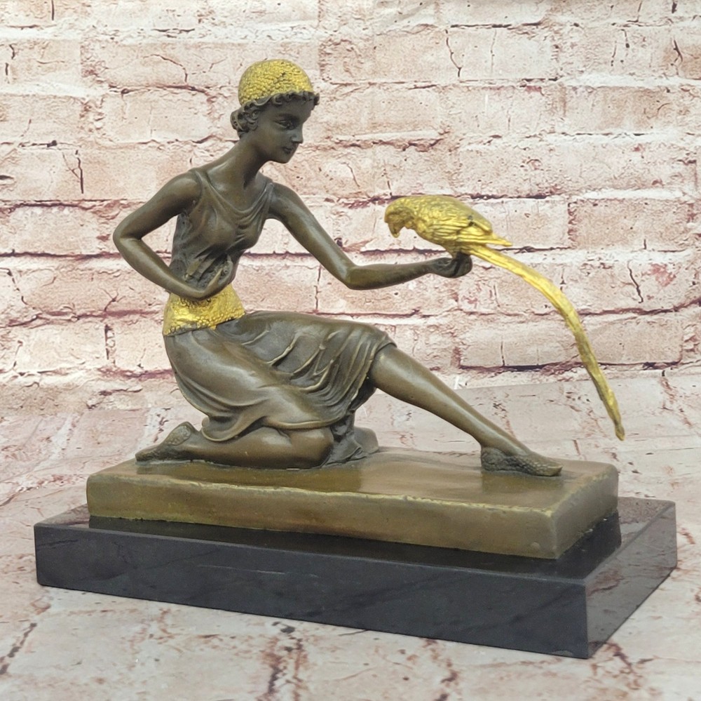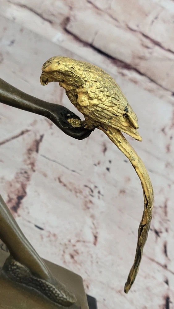 Condition : This sculpture is in perfect condition. Bronze Dimensions with Marble Base: Height 10" x Width 10" Marble Dimensions: 10" X 4 1/2" Height without base: 9" Weight: 12 LBS Inventory: 29DS1484292 Immerse yourself in the world of elegance and exoticism with this enchanting bronze sculpture titled "The Bird Whisperer," crafted with meticulous detail by the renowned artist Chiparus. This exquisite piece brings to life a scene of sophistication, as a well-dressed woman engages with an exotic parrot. Every element, from the vibrant patina on her golden dress to the intricate details of the parrot's colorful plumage, is a testament to the artist's exceptional skill and creativity. Using the time-honored "Lost Wax Method," this sculpture captures the essence of the moment in exquisite bronze. The golden dress and silver accessories of the woman shimmer with a touch of opulence, while the parrot's vivid colors add vibrancy and vitality to the composition. Mounted on a sleek black marble base, this sculpture exudes elegance and sophistication, making it a captivating addition to any art collection or interior decor. For art enthusiasts and nature lovers alike, "The Bird Whisperer" offers a harmonious blend of beauty and exotic charm. Signed by the artist Chiparus, this bronze sculpture is a timeless masterpiece that invites you to appreciate the artistry and grace of the human form in communion with nature's vibrant beauty. Bronze Art Nouveau Deco Sculpture Deco Girl w/ Parrot by Chiparus Home Decor DS-148BG Video will open in a new window Using the eBay App? Paste link into a browser window: [isdntekvideo]