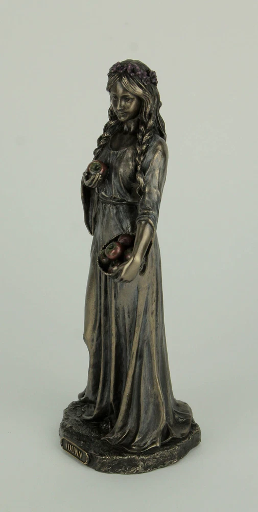 In Norse mythology, Idunn is the goddess associated with youth and apple, she is also the wife of Bragi, the god of poetry. Idunn is the keeper of the magic immortality apples, which the Norse gods must consume to avoid old age. The trickster god Loki once tricked Idunn and kidnapped Idunn to the realm of the giants which caused the other Norse gods to grow old, Loki later rescued Idunn by turning into an eagle and carrying her away in his claws. This beautifully crafted cold-cast bronze statue of Idunn measures 8.5 inches high, 3.25 inches long, and 3 inches wide, and depicts her standing in a dress on a stone path holding a basket of magic apples in her hands, and wearing a crown of pink flowers in her hair. Our eBay Store About Us Add to Favorite Sellers Bronze Finish Idunn Norse Goddess of Spring and Youth Statue OVERALL SIZE - 8.5 Inches High, 3.25 Inches Long, 3 Inches Wide Intricately Sculpted in Cold Cast Bronze with Lifelike Character Showing Fold Lines On the Dress, a Stone Texture On the Base and a Soft Expression On Idunn's Face Polished Bronze Finish with a Grey Color Wash On the Dress and Red On the Apples Depicts Idunn Standing On a Stone Path Holding a Basket of Magic Apples Her Left Hand and One In Her Right, She Wears a Crown of Pink Flowers in Her Long Braided Hair A Beautifully Detailed Work of Art and Makes a Wonderful Gift for Anyone Interested in Norse Mythology In Norse mythology, Idunn is the goddess associated with youth and apple, she is also the wife of Bragi, the god of poetry. Idunn is the keeper of the magic immortality apples, which the Norse gods must consume to avoid old age. The trickster god Loki once tricked Idunn and kidnapped Idunn to the realm of the giants which caused the other Norse gods to grow old, Loki later rescued Idunn by turning into an eagle and carrying her away in his claws. This beautifully crafted cold-cast bronze statue of Idunn measures 8.5 inches high, 3.25 inches long, and 3 inches wide, and depicts her standing in a dress on a stone path holding a basket of magic apples in her hands, and wearing a crown of pink flowers in her hair. Product Details Color Bronze Height 8.5 Length 3.25 Weight 1.05 LB