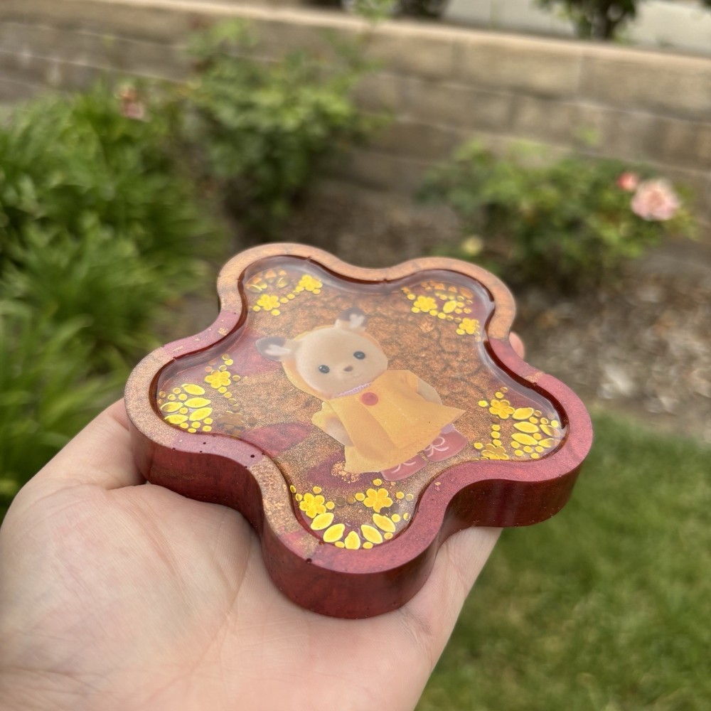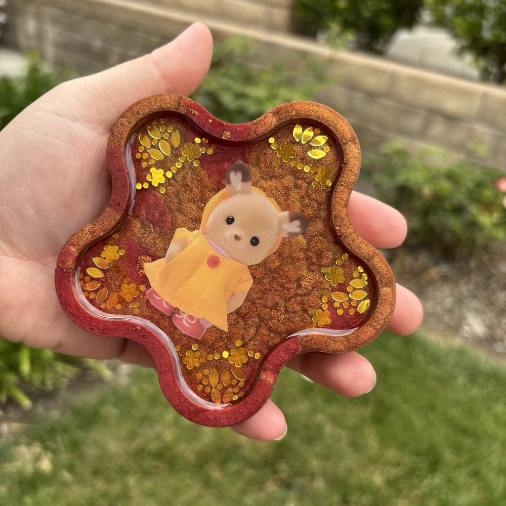 ‘Gold In Showers’ Calico Critters Inspired Colorshifting Maroon and Gold Toned Flower Shaped Resin Coaster Handmade by Shop EarthySmurf. *Please note, resin is an imperfect art. Craters, holes, sharp edges, bubbles and more may be present in your piece. Please examine all pictures*