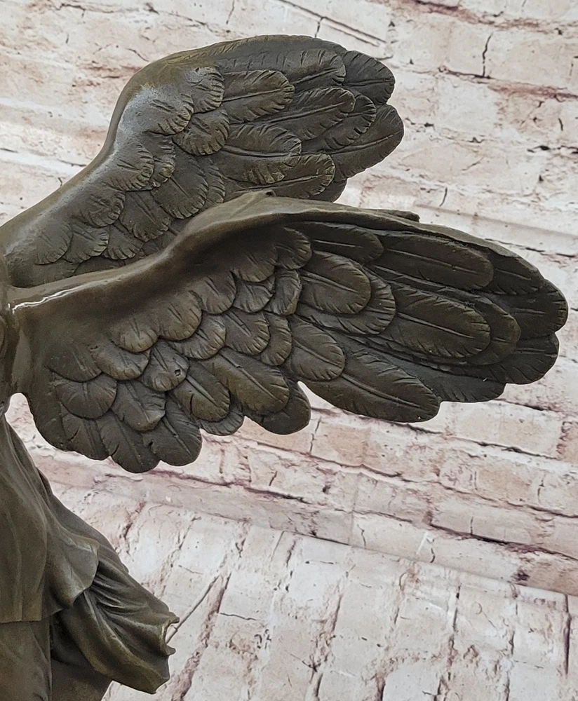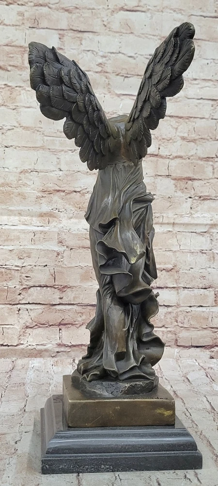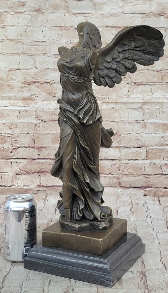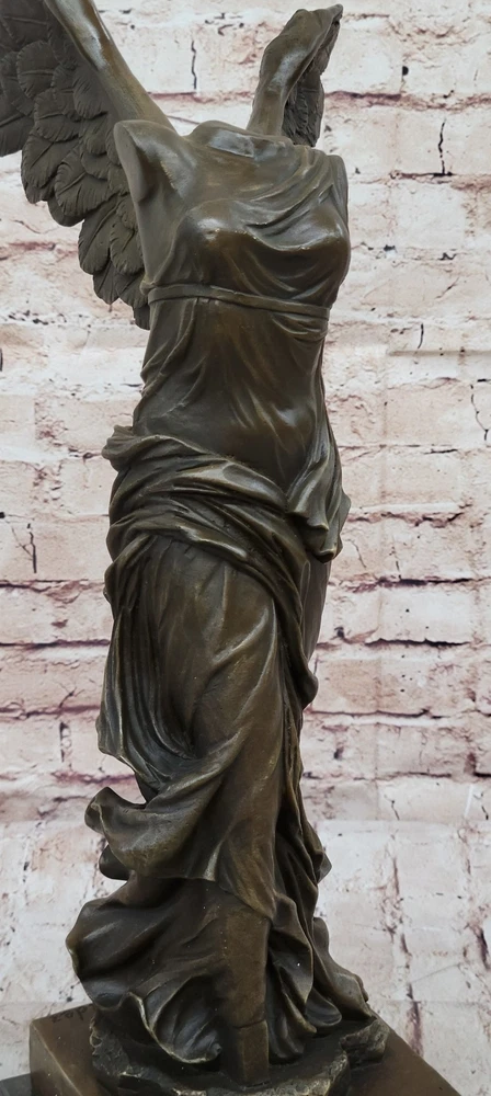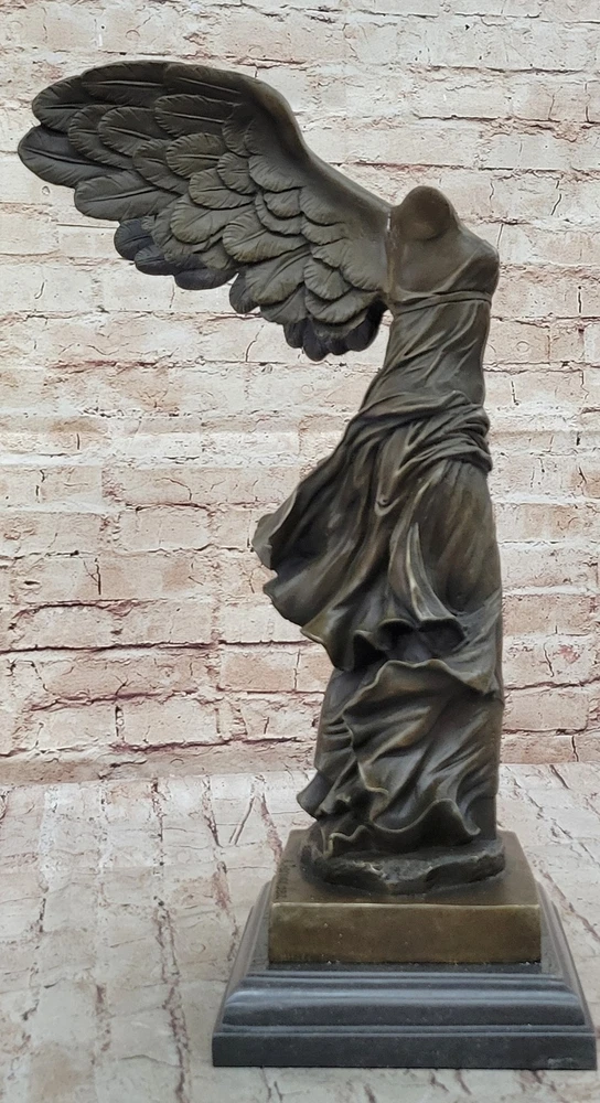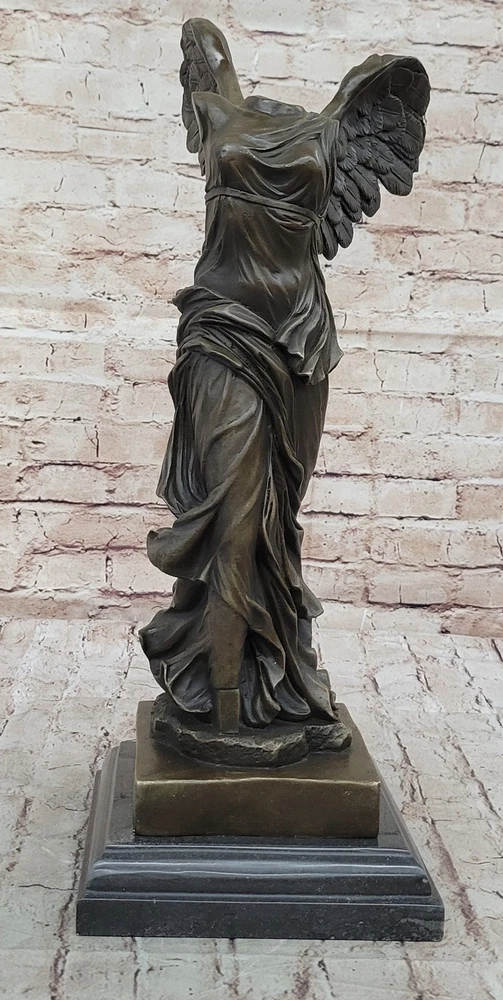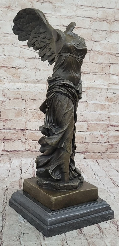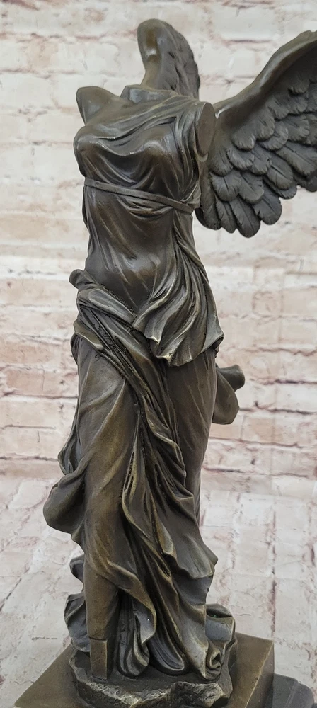 Bronze Nike Winged Victory Sculpture Statue Louvre Smothrace Paris Artwork NR Bronze Nike Winged Victory Sculpture Statue Louvre Smothrace Paris Artwork NR Condition : This sculpture is in perfect condition. Bronze Dimensions with Marble Base: Height 19" X Width 10" Marble Dimensions:7" X 7" Height without base:18" Weight:21 LBS Inventory:34YRD49310243 This bronze replica captures the essence of the Winged Nike of Samothrace, a renowned masterpiece from antiquity and a symbol of victory in Greek mythology. The original marble statue was discovered on the island of Samothrace in 1863 by Charles Champoiseau, a French consul and amateur archaeologist. The Winged Nike of Samothrace is considered one of the most significant sculptures from the Hellenistic period, showcasing the skill of an unknown Rhodian sculptor between 220-190 BCE. In Greek mythology, Nike, the Winged Goddess of Victory, was associated with triumph in both war and contests. Depicted with wings and often seen standing alongside deities like Zeus, Athena, and Ares, Nike adorned winners with wreaths and sashes. Despite significant damage to the original statue, including the loss of its head and outstretched arms, this bronze replica faithfully captures the grace and beauty of the goddess. Crafted using the lost-wax method, a technique that preserves the original likeness, this archaic duplicate stands as a testament to the artistry and mythology of ancient Greece. The bronze sculpture, stained with a brown patina finish, immortalizes the goddess as she perpetually stands upon a black marble base. It offers enthusiasts of celebrated mastery and Greek mythology the opportunity to appreciate this iconic representation on a daily basis. Winged Nike Samothrace Louvre Paris Bronze Marble Victory Statue Sculpture Art www.bronzhaus.com Video will open in a new window Using the eBay App? Paste link into a browser window: [isdntekvideo] Shipping Terms : Most of our items are shipped via USPS (United States Postal Service) mail or UPS. Most orders are shipped within 24-48 hours of purchase. Please be aware that not all items are available for USPS shipping due to size and weight. We do ship to Hawaii, Alaska, Canada, Puerto Rico, APO/AE, and U.S. Virgin Islands, however, an additional charge may be required. Please contact us before making any purchases in these areas. For Non-USA customers, you may be responsible for all duty, tax, brokerage fees that may be due upon delivery (shipping costs cover freight charges only). We also ship internationally. Please refer to the "Shipping and Handling" chart for the rates for each area. Payment : We accept just about any form of payment. PayPal, Master Card, Visa or American Express credit cards. Money orders, cashiers checks, and even personal or business checks. For governmental institutions, we will also accept a purchase order. Please understand that for personal or business checks we have to wait for the check to clear (usually 7 days) before shipping. Condition : New Detailed Hand Crafted Hot Cast Bronze Satisfaction Guaranteed. This is Stock Photo, Slight Color Variation!! Listing and template services provided by inkFrog