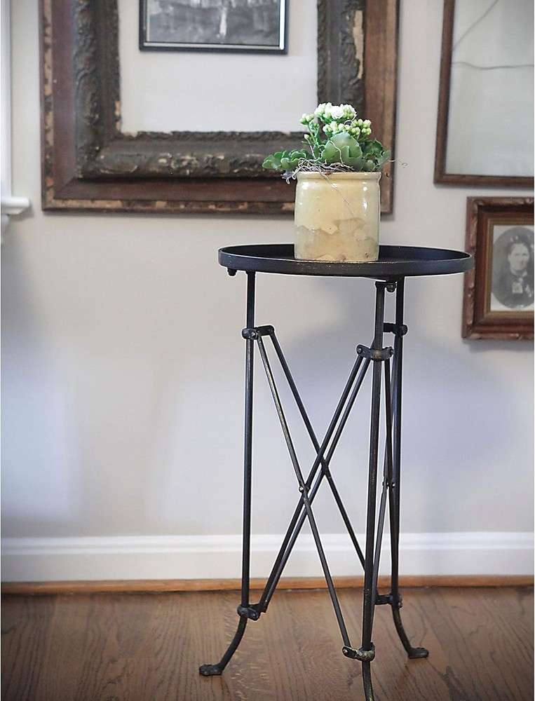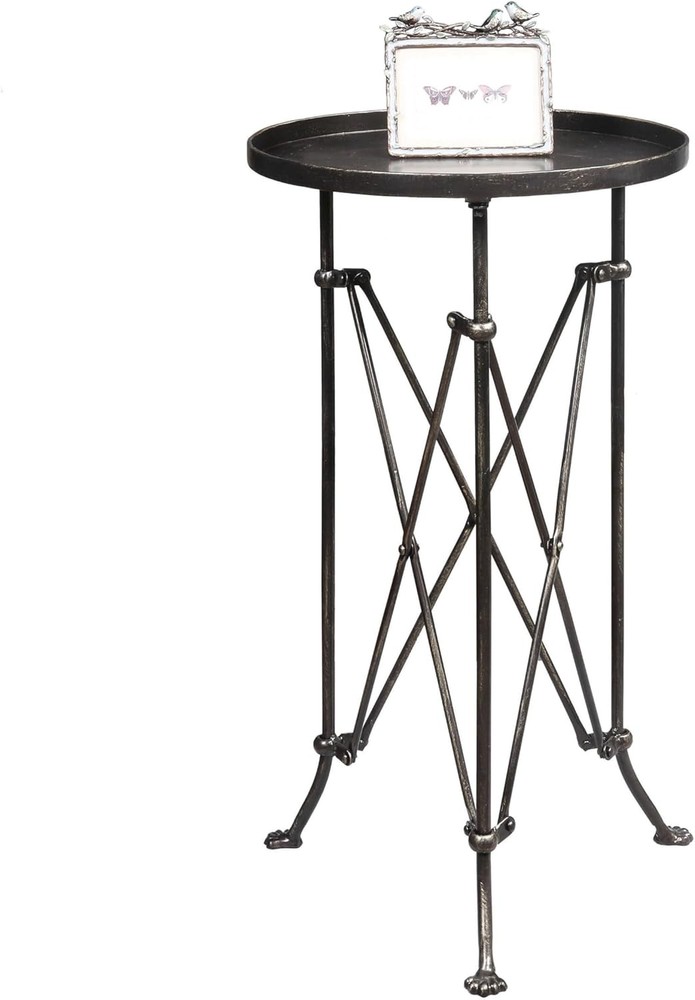 Creative Co-Op Round Bronze Metal Accent Table Product Details Brand: Creative Co-Op Product Dimensions: 14.25"D x 14.25"W x 25"H Maximum Weight Recommendation: 12 Pounds Color: Bronze Product Care Instructions: Wipe with Dry Cloth Item WeightFrame Material: 12.3 PoundsMetal Top Material TypeShape: MetalAccent Table Metal construction Top tray is 14. 5" round with 1" raised sides Legs are 1" round and 25" high Wipe clean with dry cloth 14. 25L x 14. 25W x 25. 25H in. This accent table is the perfect size for just about anywhere in the home. The slightly distressed bronze finish coupled with whimsical feet make it a unique choice for any décor. Some assembly is required.