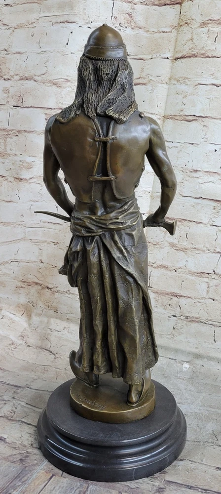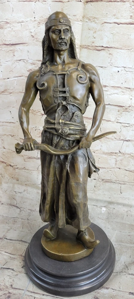 Bronze Sculpture Stunning Hot Cast Middle Eastern Warrior Artwork Figurine Sale Bronze Sculpture Stunning Hot Cast Middle Eastern Warrior Artwork Figurine Sale Condition : This sculpture is in a perfect condition. Bronze Dimensions with Marble Base: Height 20" X Width 7" Marble Dimensions: Diameter 7" Height without base:19" Weight:18 LBS Inventory:48STE269C9584 "L'Emir" is a striking and evocative bronze sculpture that pays homage to the powerful nomadic chieftains of the Middle East, reminiscent of those who once confronted the crusaders. Every detail of this sculpture is meticulously crafted to capture the essence of this formidable figure. From his piercing eyes and flowing beard to his robust physique, leather vest, flowing robe, and distinctive pointed footwear, every aspect of this chieftain's appearance commands attention. He brandishes a long, curving sword, adding to the sense of authority and strength that radiates from this sculpture. This exquisite artwork is crafted entirely from bronze, a testament to the artist's dedication to quality and artistry. Handmade with care, it undergoes the time-honored Lost Wax Method of casting, ensuring that every nuance of the original design is faithfully preserved. The sculpture is proudly mounted on a sturdy marble base, adding a touch of elegance to its commanding presence. It bears the signature of the talented artist, M.A. L. Goudray, further authenticating its uniqueness and value. "L'Emir" is a captivating piece that invites viewers to appreciate the rich history and culture of the Middle East through the art of bronze sculpture. STUNNING LARGE HOT CAST AUSTRIAN VIENNA BRONZE ORIENTALIST ARAB WITH SWORD SALE www.bronzhaus.com Video will open in a new window Using the eBay App? Paste link into a browser window: [isdntekvideo] Shipping Terms : Most of our items are shipped via USPS (United States Postal Service) mail or UPS. Most orders are shipped within 24-48 hours of purchase. Please be aware that not all items are available for USPS shipping due to size and weight. We do ship to Hawaii, Alaska, Canada, Puerto Rico, APO/AE, and U.S. Virgin Islands, however, an additional charge may be required. Please contact us before making any purchases in these areas. For Non-USA customers, you may be responsible for all duty, tax, brokerage fees that may be due upon delivery (shipping costs cover freight charges only). We also ship internationally. Please refer to the "Shipping and Handling" chart for the rates for each area. Payment : We accept just about any form of payment. PayPal, Master Card, Visa or American Express credit cards. Money orders, cashiers checks, and even personal or business checks. For governmental institutions, we will also accept a purchase order. Please understand that for personal or business checks we have to wait for the check to clear (usually 7 days) before shipping. Condition : New Detailed Hand Crafted Hot Cast Bronze Satisfaction Guaranteed. This is Stock Photo, Slight Color Variation!! Listing and template services provided by inkFrog