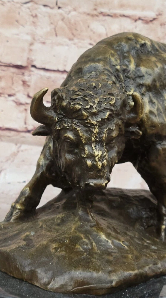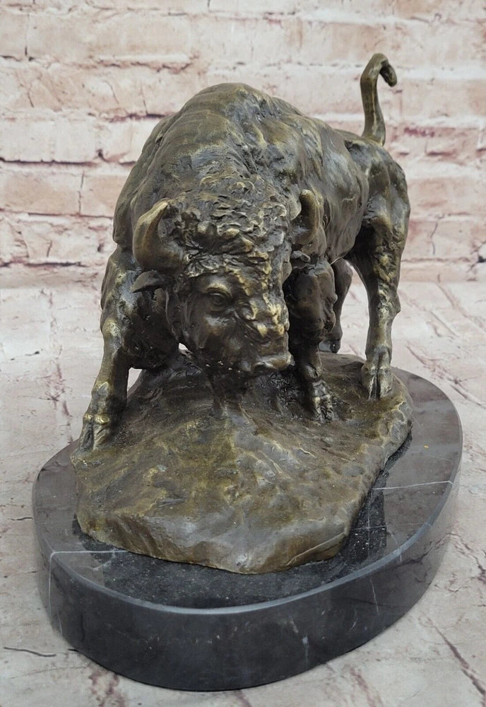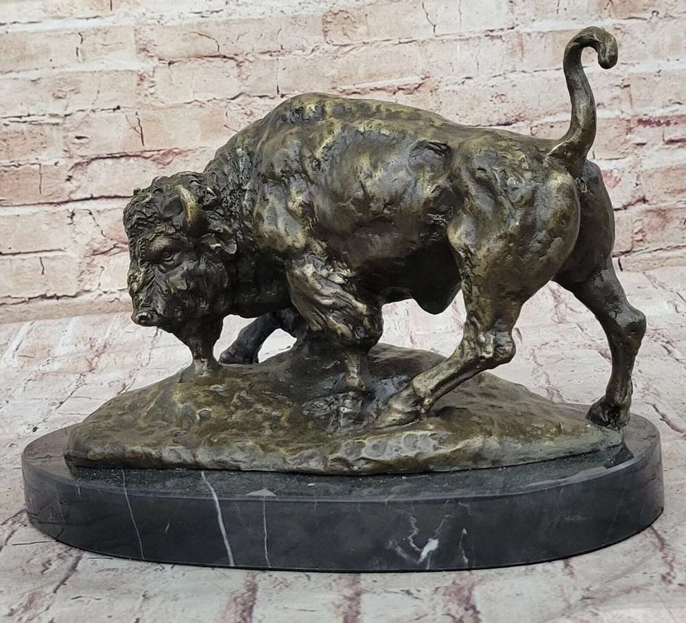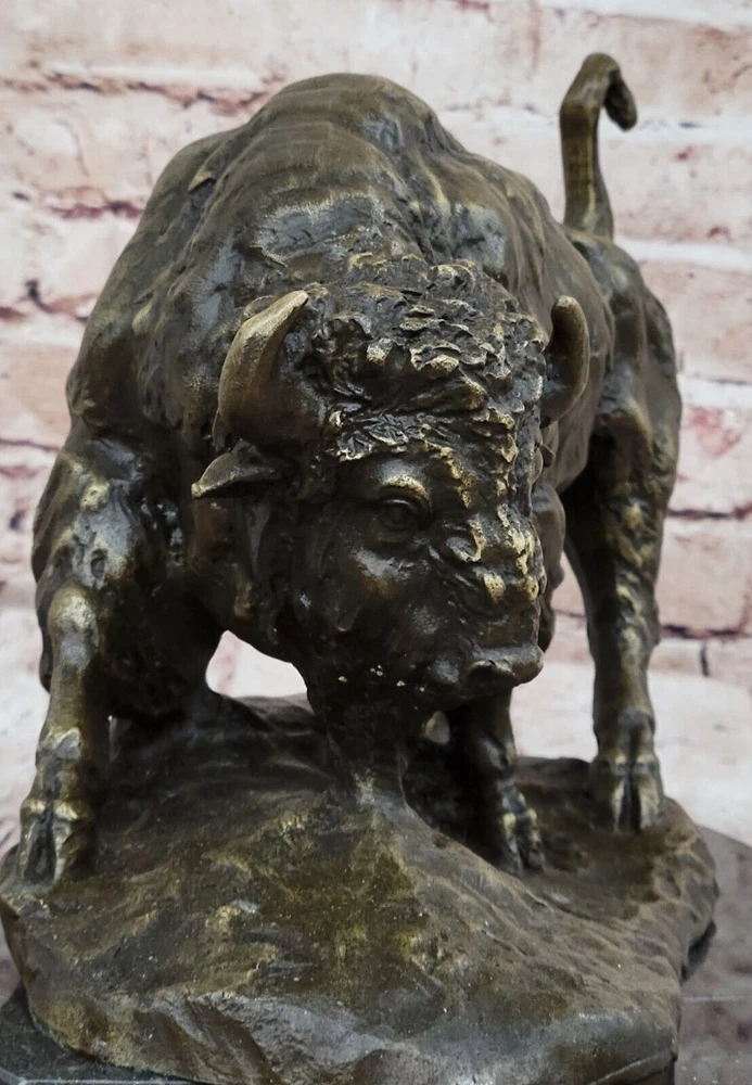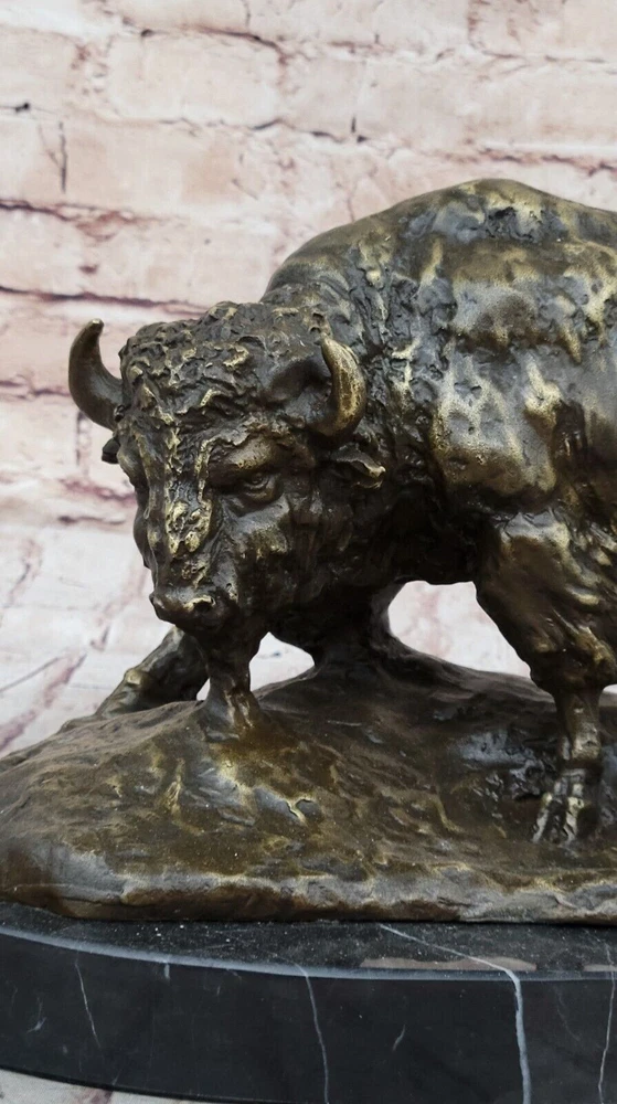 Condition : This sculpture is in perfect condition. Bronze Dimensions with Marble Base: Height 8" X Width 14" Marble Dimensions: Diameter 13" Height without base:7" Weight:13 LBS Inventory:35Y5856353 Introducing the awe-inspiring "Solid Bronze American Buffalo Statue Figure on Marble Base" by the acclaimed artist Barye. This remarkable sculpture captures the majestic essence of the iconic American buffalo, a symbol of strength, resilience, and the untamed spirit of the Wild West. Crafted with exceptional artistry, this solid bronze statue exhibits intricate details that bring the buffalo to life. From the powerful muscles to the finely textured fur, every aspect of this sculpture showcases the artist's dedication to capturing the essence of this magnificent creature. The brown patina finish adds depth and richness, accentuating the intricate details and lending an air of timelessness to the piece. Mounted securely on a marble base, this sculpture exudes elegance and serves as a solid foundation for the buffalo's presence. The combination of the sturdy bronze and the luxurious marble base creates a visually striking contrast, elevating the overall aesthetic appeal of the artwork. Created using the time-honored lost wax method, this sculpture represents the culmination of meticulous craftsmanship. This traditional technique ensures that each piece is a unique work of art, faithfully preserving the artist's vision and attention to detail. Immerse yourself in the spirit of the American West with this extraordinary bronze buffalo statue. Whether you are an avid art collector, a lover of wildlife, or simply seeking a statement piece to adorn your space, this sculpture is sure to captivate and inspire. Embrace the untamed spirit of the American buffalo and bring a touch of wilderness into your home or office with this exceptional artwork. Signed American Buffalo Bull Bronze Sculpture by Barye on Marble Base Figure Art www.bronzhaus.com Video will open in a new window Using the eBay App? Paste link into a browser window: [isdntekvideo]