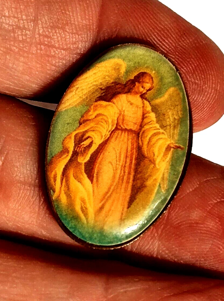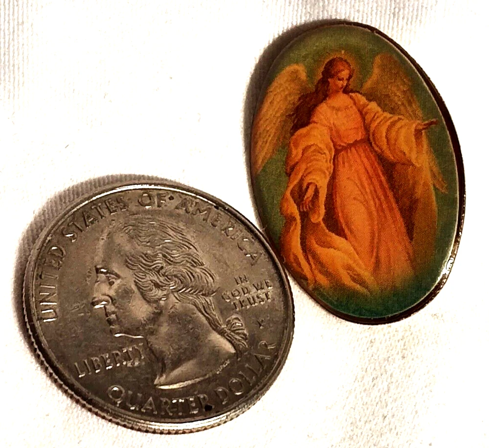 Brooch Lapel Hat Scarf Pin VTG St Mary Guardian Angel Winged Gold Tone Oval DESCRIPTION: Offered is a vintage oval brooch or pin. It is made of gold tone metal with a Lucite front featuring St Mary the guardian angel. MEASUREMENT : 1 1/8 tall, 3/4" across. See size comparison pictured with a coin and hand. CONDITION: In good estate condition, See close-ups. POSTAGE: Buyer pays USPS ground advantage mail for 5 oz packaged weight.