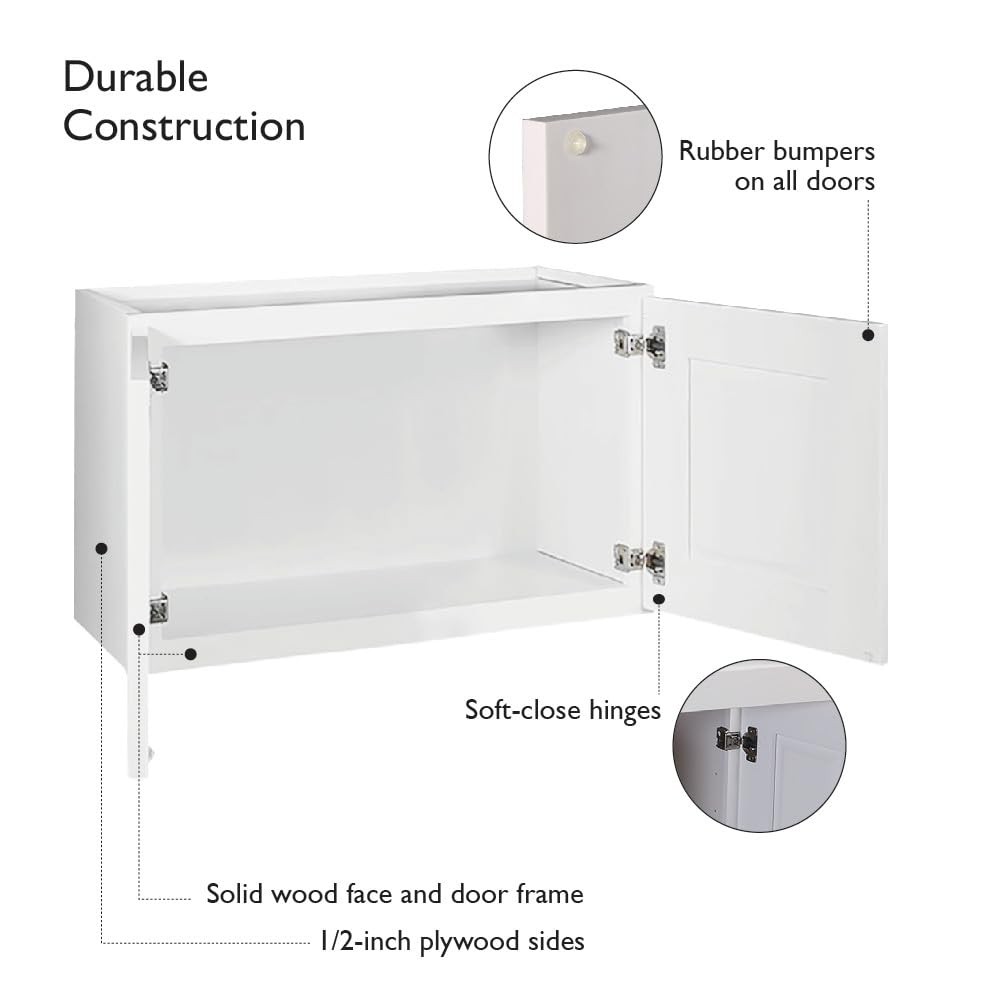 Kitchen Bridge Wall Cabinet W3012: Measures 12-inches H by 30-inches W and features 2 doors Durable Craftsmanship: Solid wood face and door frame with 1/2-inch plywood sides ensure long-lasting performance Soft Close Doors: This kitchen cabinet comes with 6-way adjustable soft-close hinges, to ensure a gentle, quiet close of cabinet doors and precise door alignment Refined Look: Finished interior enhances the cabinet's overall aesthetic and durability Versatile Storage: Designed to maximize kitchen organization, offering ample space for all your essentials